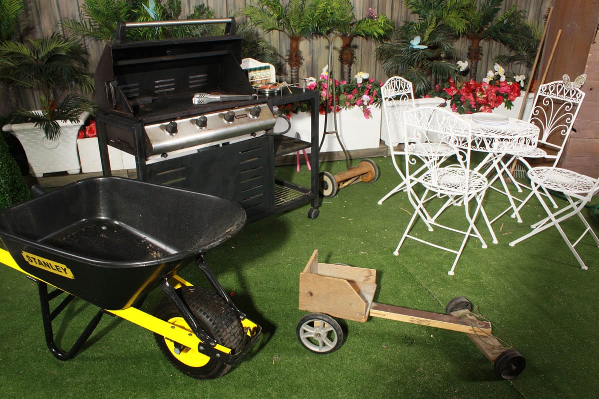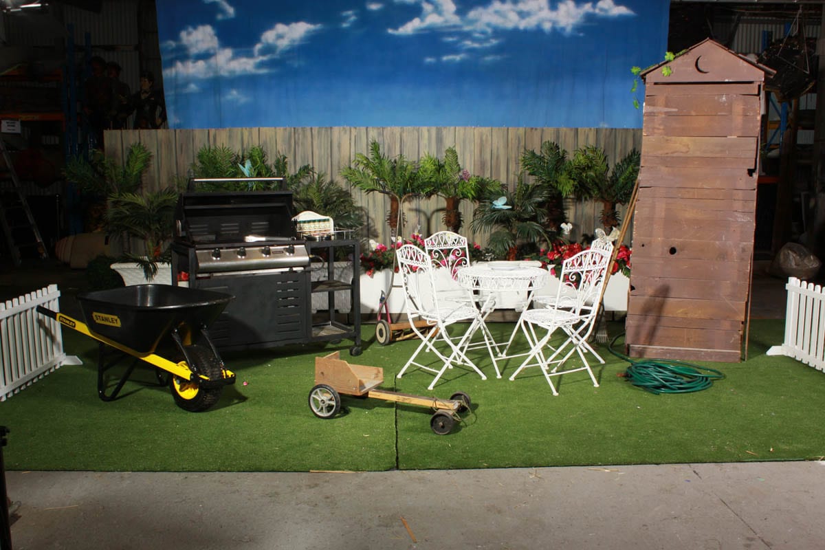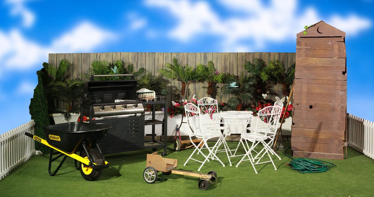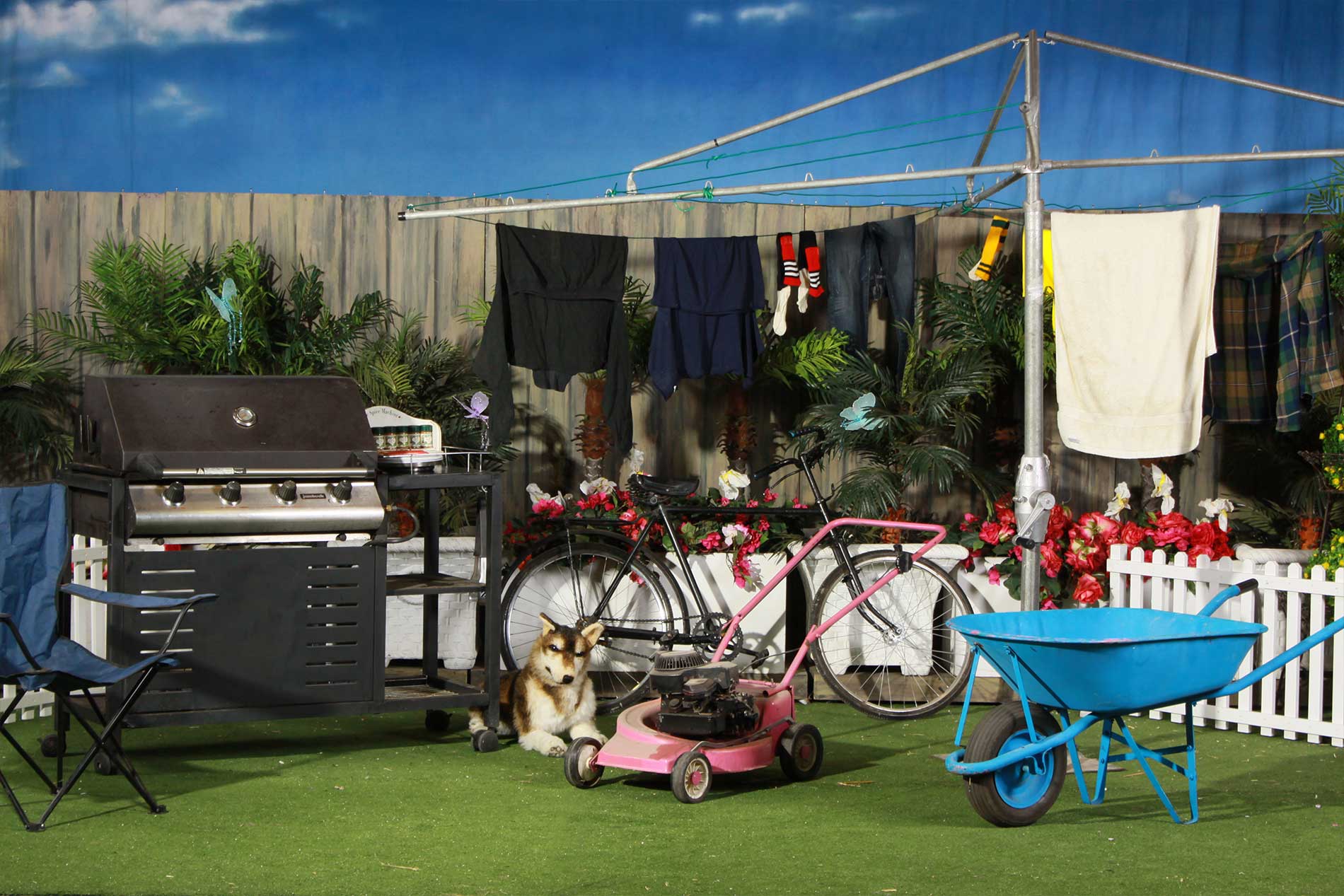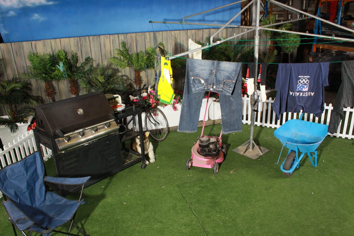 What a microcosm of Australiana. Not just a back yard – we give you the quintessential Australian back yard with all the classic props you know and love and also a bit of fantasy: wooden gnomes and cricket bats, striped canvas deck chairs and brightly painted garden tools, picket fences with passion fruit vines, inflatable pools and fancy topiary, fun poolside figurines and hedgerows – even the household dog. Plus we have a great selection of rustic furniture, including large tables and bench seats.