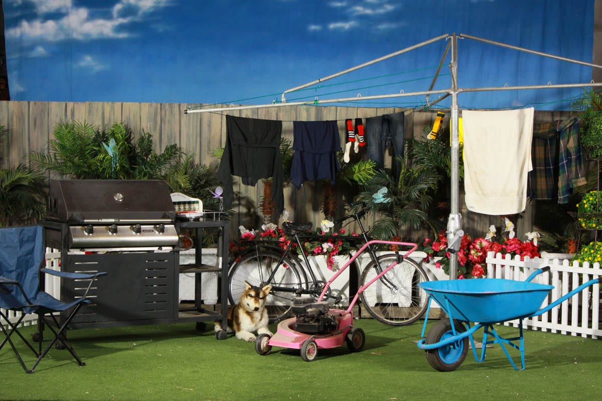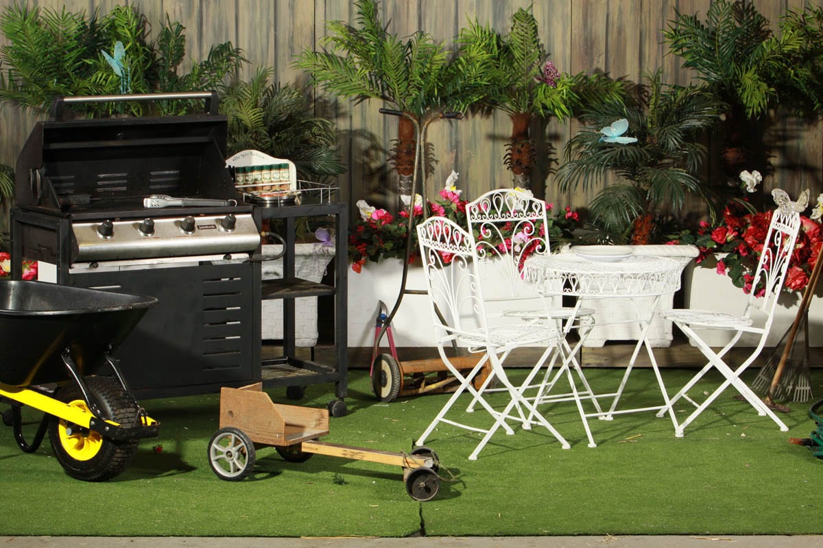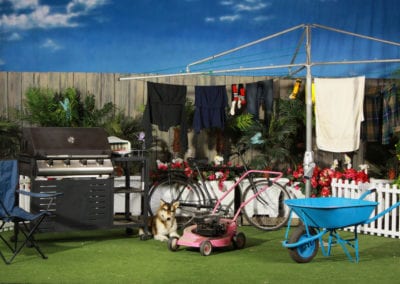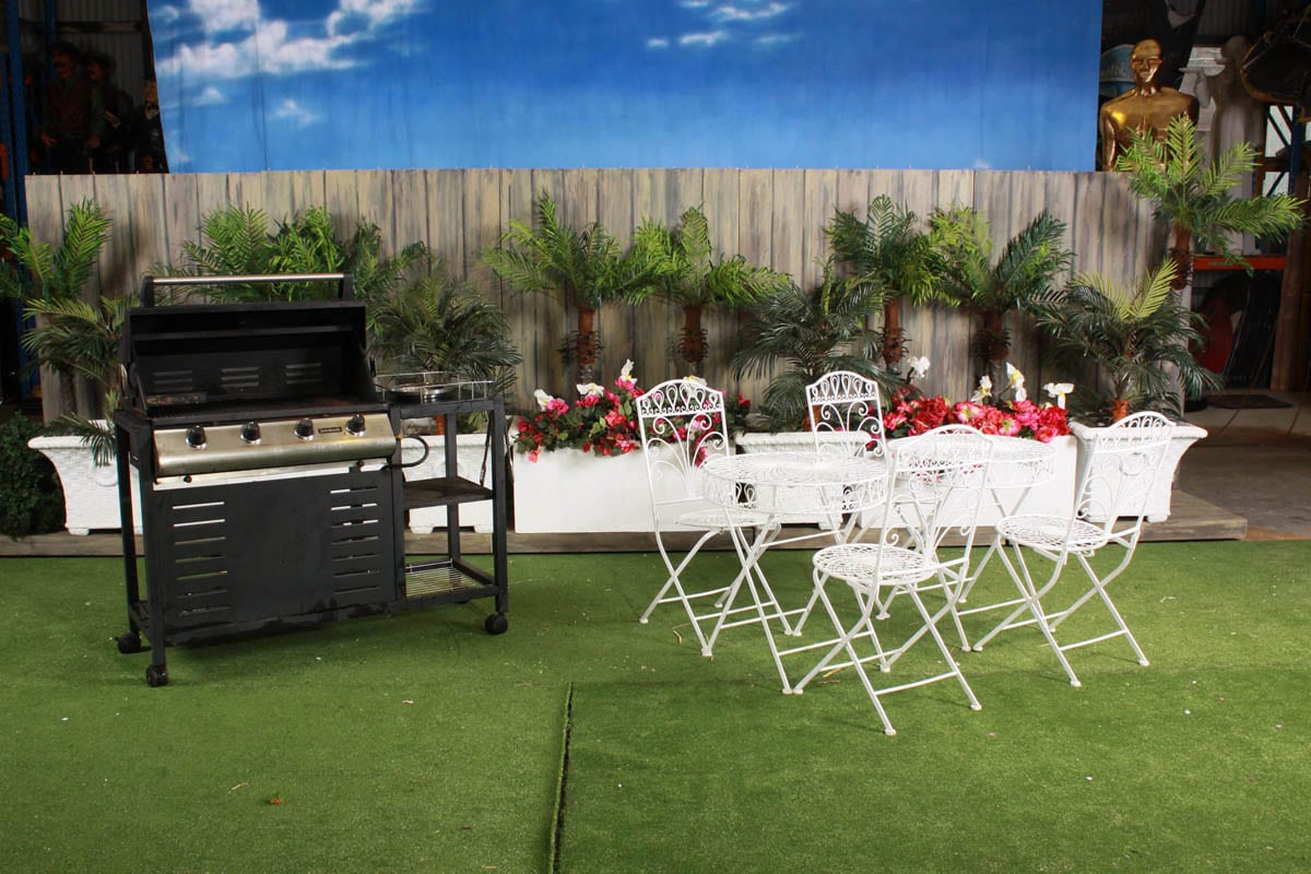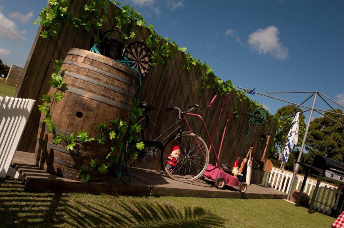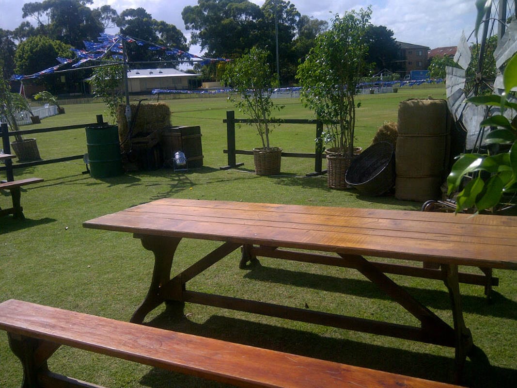 What a microcosm of Australiana. Not just a back yard – we give you the quintessential Australian back yard with all the classic props you know and love and also a bit of fantasy: wooden gnomes and cricket bats, striped canvas deck chairs and brightly painted garden tools, picket fences with passion fruit vines, inflatable pools and fancy topiary, fun poolside figurines and hedgerows – even the household dog. Plus we have a great selection of rustic furniture, including large tables and bench seats.