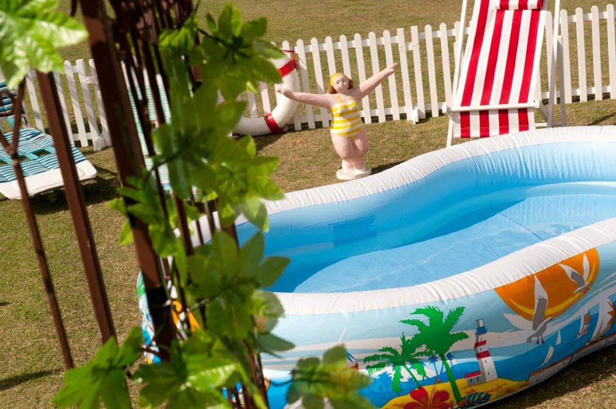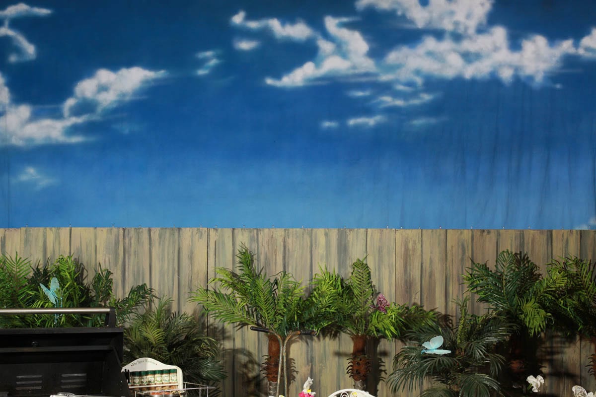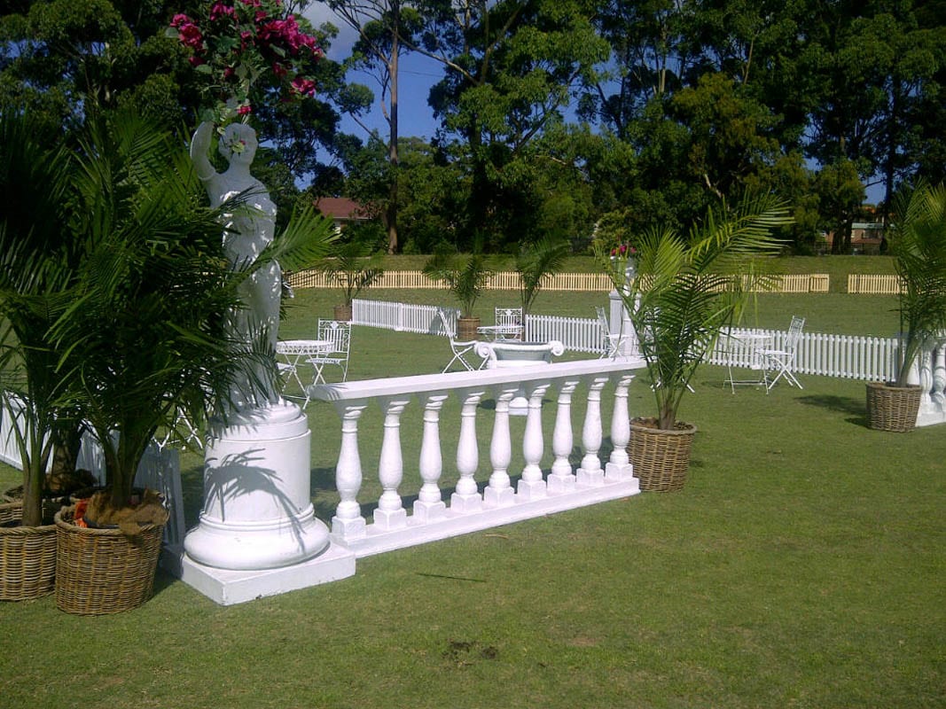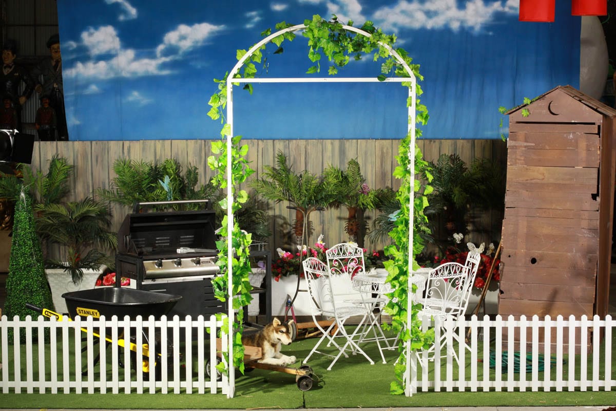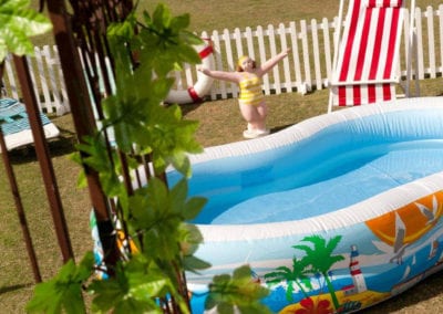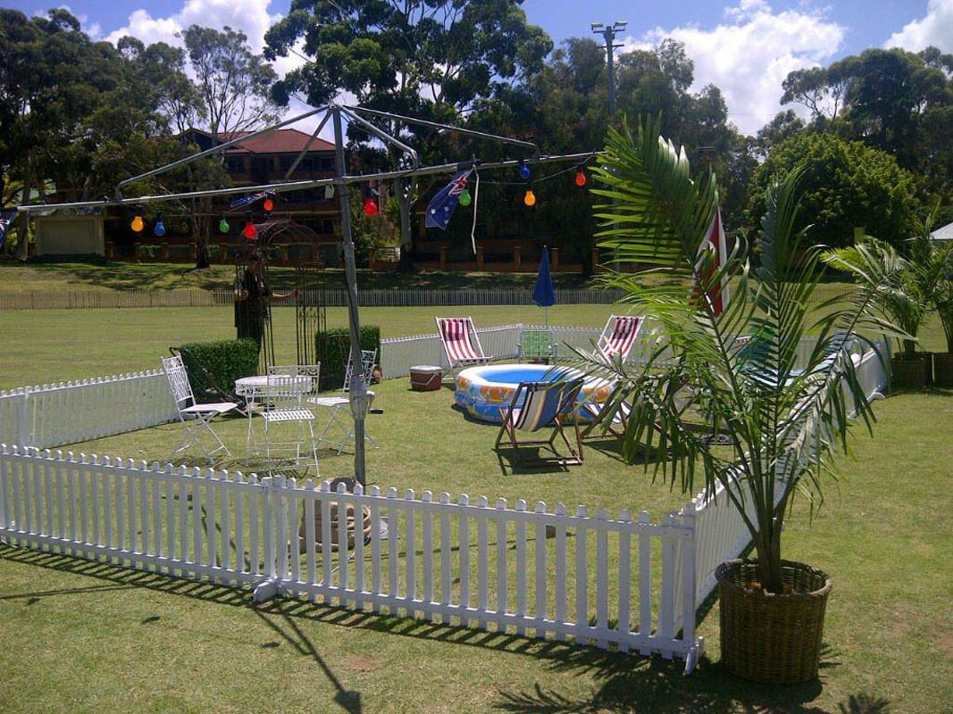 What a microcosm of Australiana. Not just a back yard – we give you the quintessential Australian back yard with all the classic props you know and love and also a bit of fantasy: wooden gnomes and cricket bats, striped canvas deck chairs and brightly painted garden tools, picket fences with passion fruit vines, inflatable pools and fancy topiary, fun poolside figurines and hedgerows – even the household dog. Plus we have a great selection of rustic furniture, including large tables and bench seats.