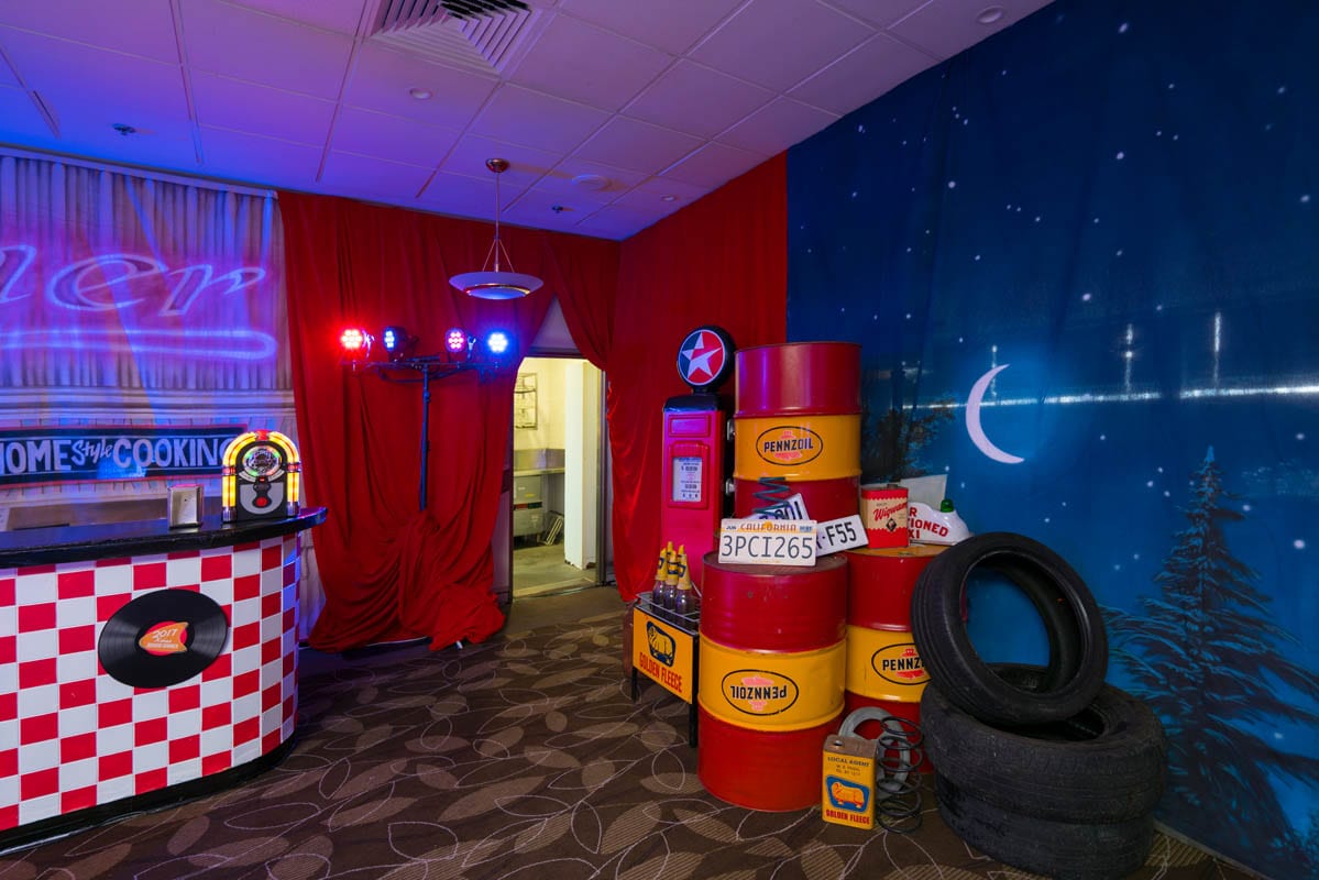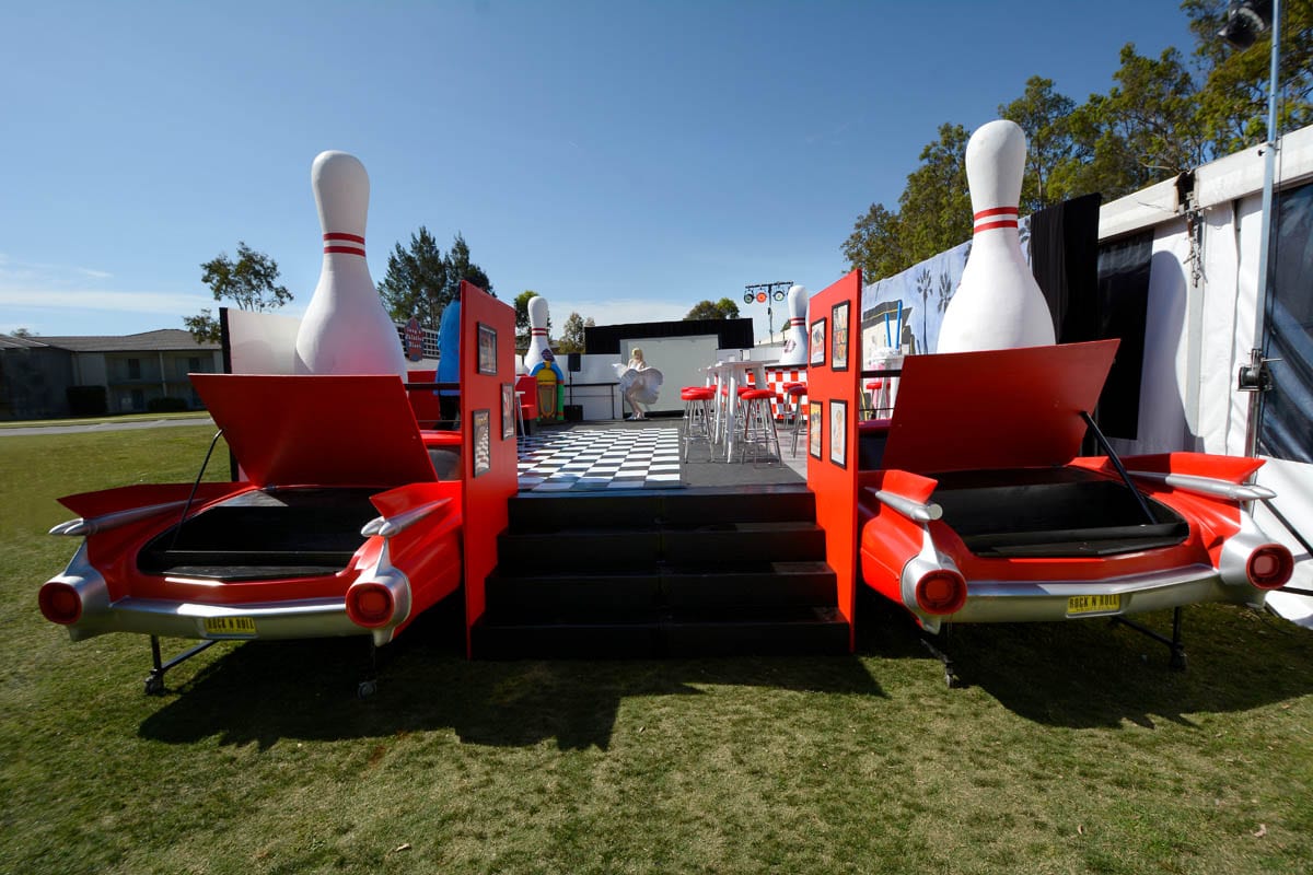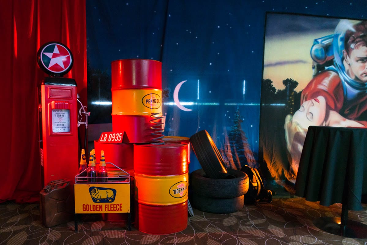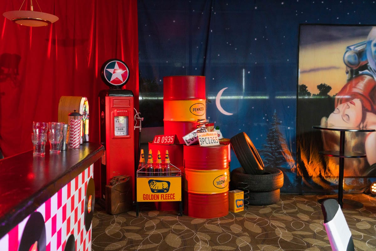 Auto shops and milk bars featured in many films of that era and here at Sydney Prop Specialists, our prop makers and stylists have put together a colourful assortment of props and painted backdrops that will transport your guests back to a 50’s auto shop and milk bar. With life size Elvis and Marilyn from that dress scene in “The Seven Year Itch”, giant ice-cream Sundays and bags of movie popcorn, car boots for beverages and food, petrol bowsers, hot rods and 44 gallon drums – the scene is set for your themed event..