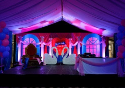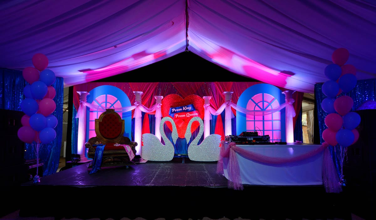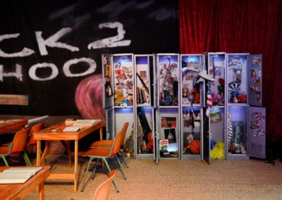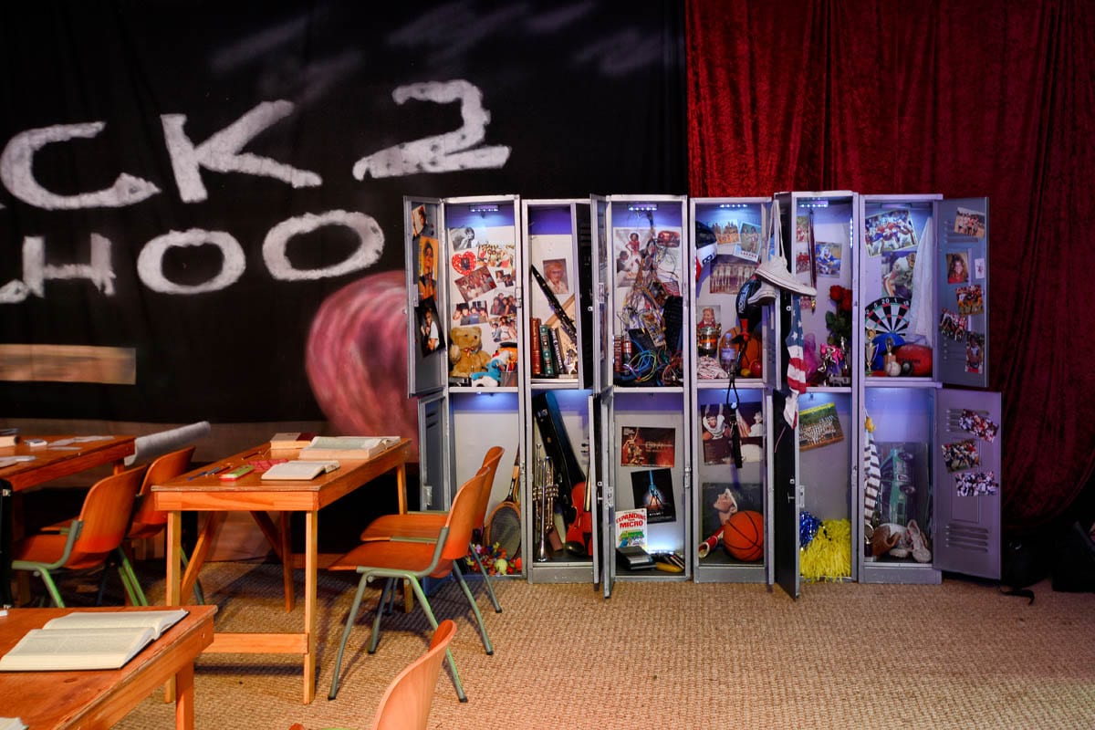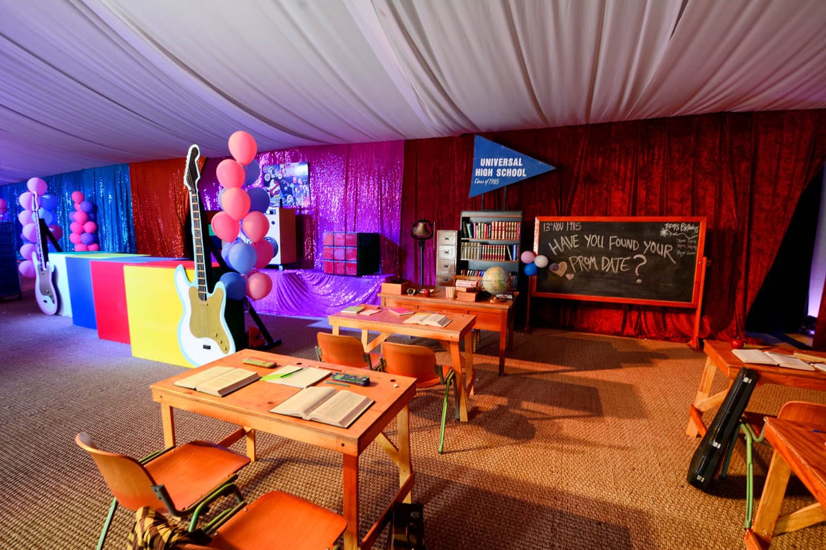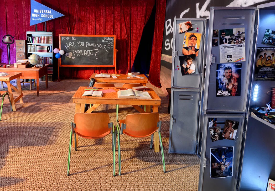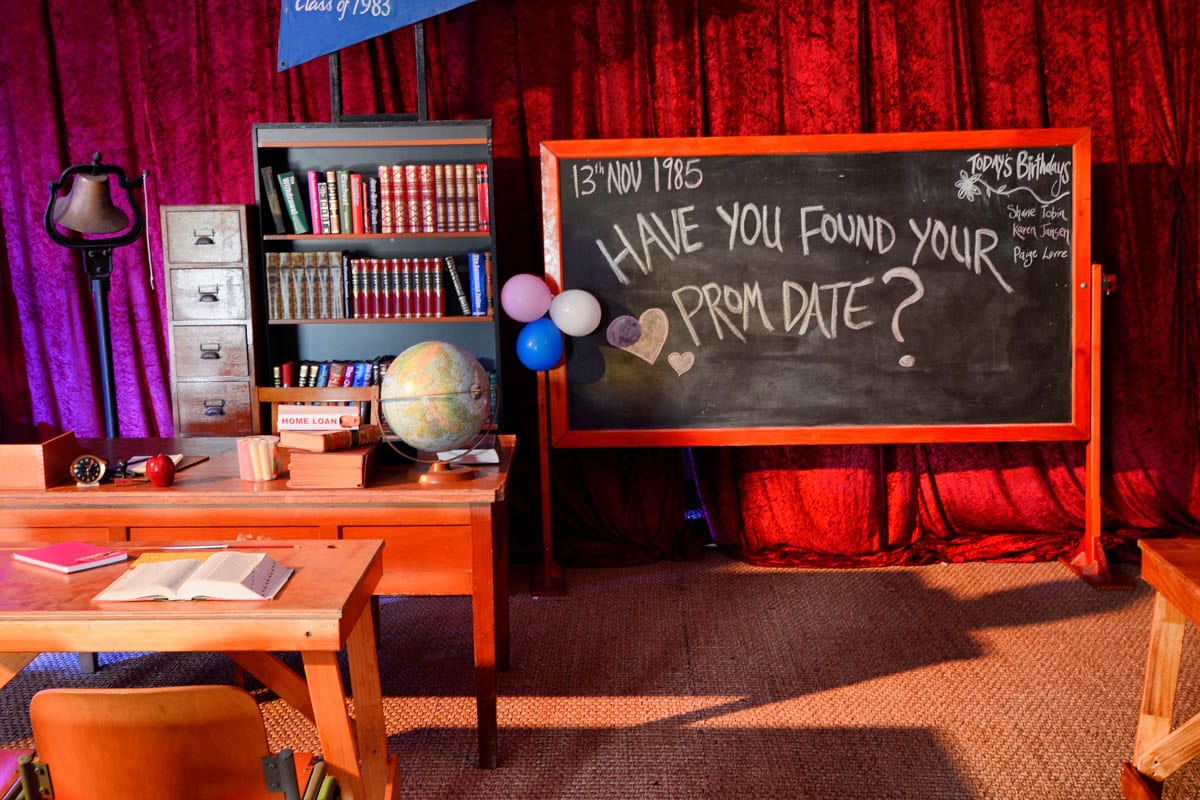 Use our school classroom props to create an 80s vibe with lockers dotted with posters and other bric-a-brac or why not recreate your high school prom? Use balloons, swans, hearts, sequinned or chiffon drapes to create the dance area and have on the stage guitars, a ghetto blaster stereo and a mic for the band to perform. Dim the lights and action!.