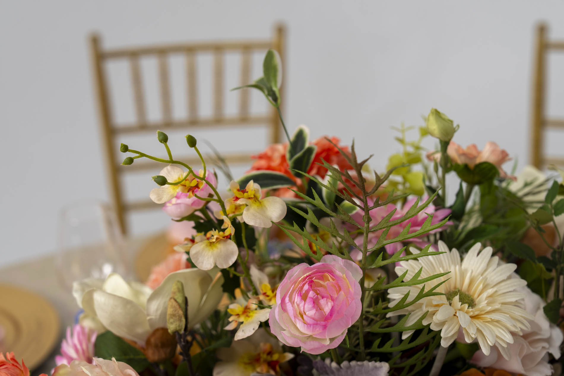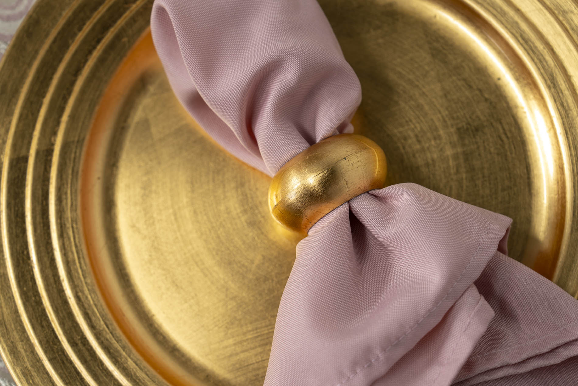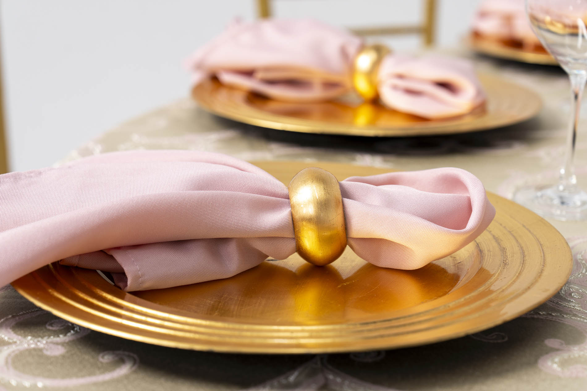 Each place setting is defined by a bold, brushed-gold charger plate, which provides a high-shine frame for the delicate napery. Soft blush-pink napkins are cinched with wide, rounded gold ring holders, echoing the metallic warmth of the chairs and charger plates. Crystal-clear stemmed glassware and polished silver cutlery complete the setting with a clean, professional finish that allows the rich colours of the florals to remain the star of the show.