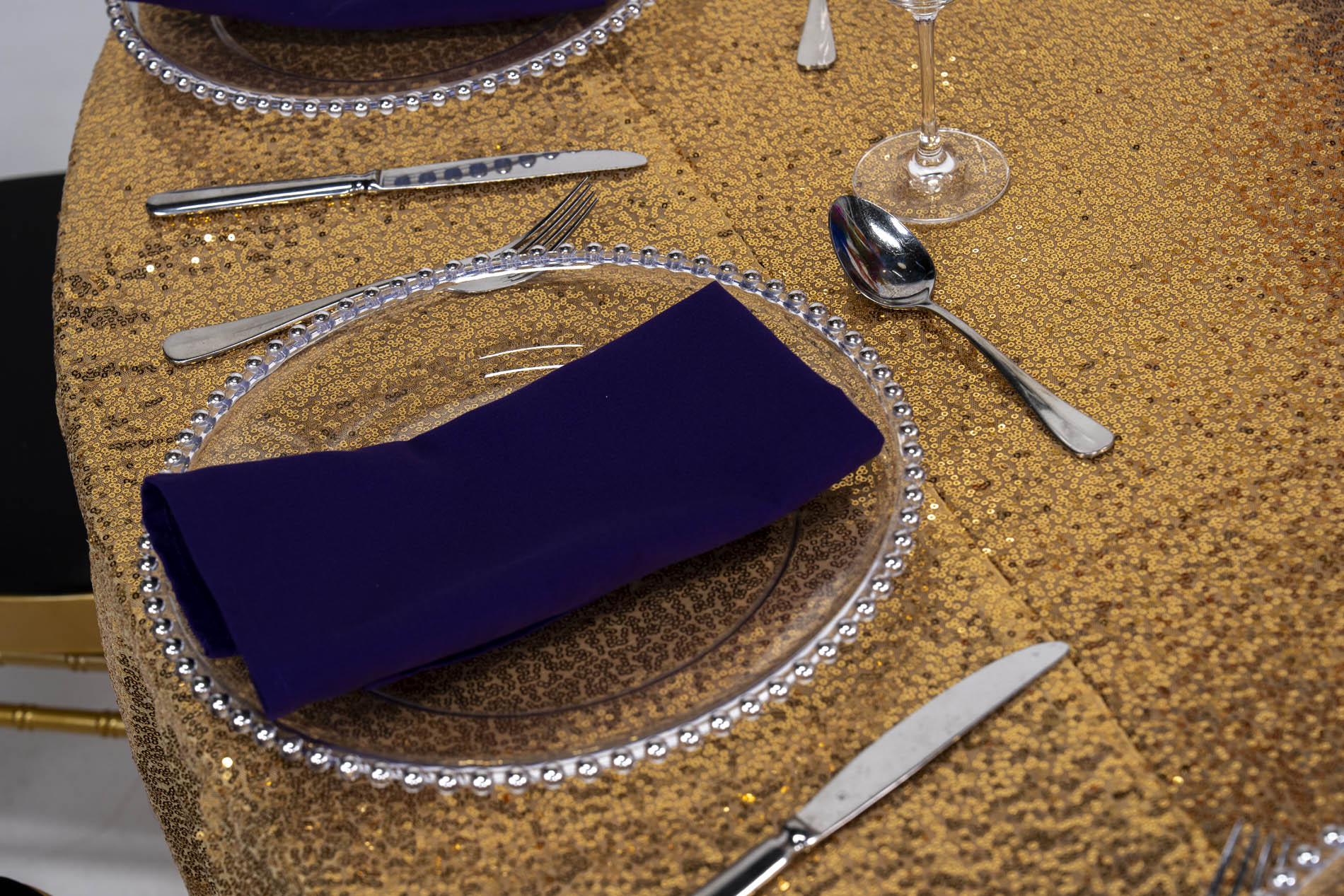 Each place setting is defined by a clear glass “beaded” charger plate, featuring a delicate rim of glass baubles that allows the gold sequins beneath to sparkle through. Deep purple napkins are placed atop the charger in a crisp, modern fold, providing a rich, regal contrast to the bright pink and gold palette. Polished silver cutlery and elegant stemmed glassware complete the setting with a clean, high-end finish.