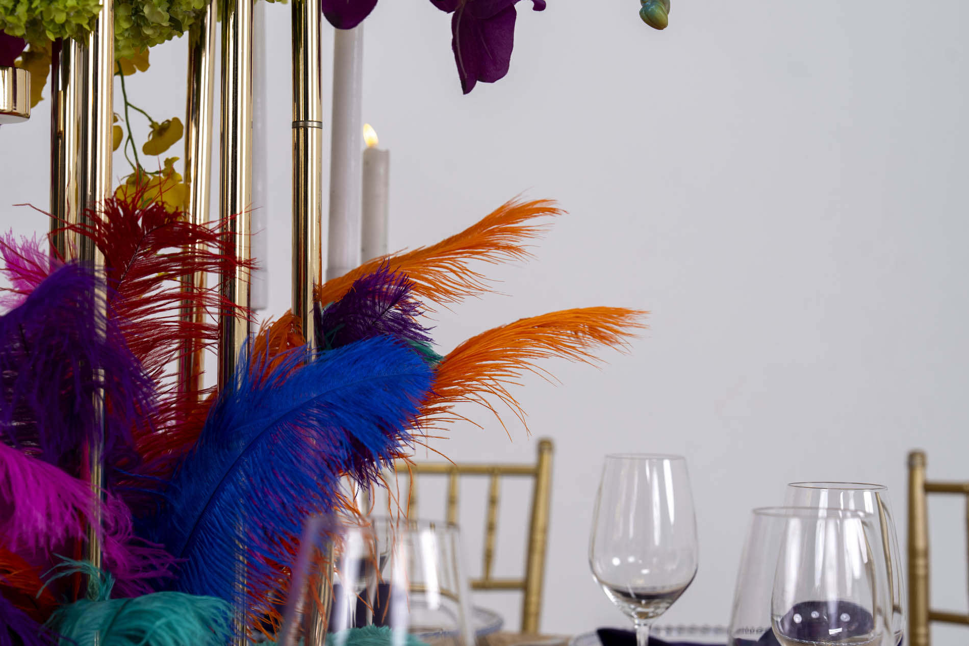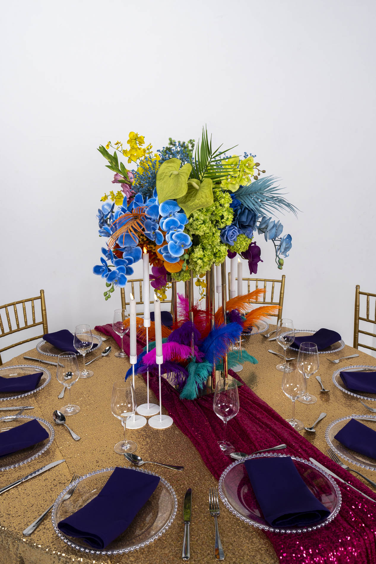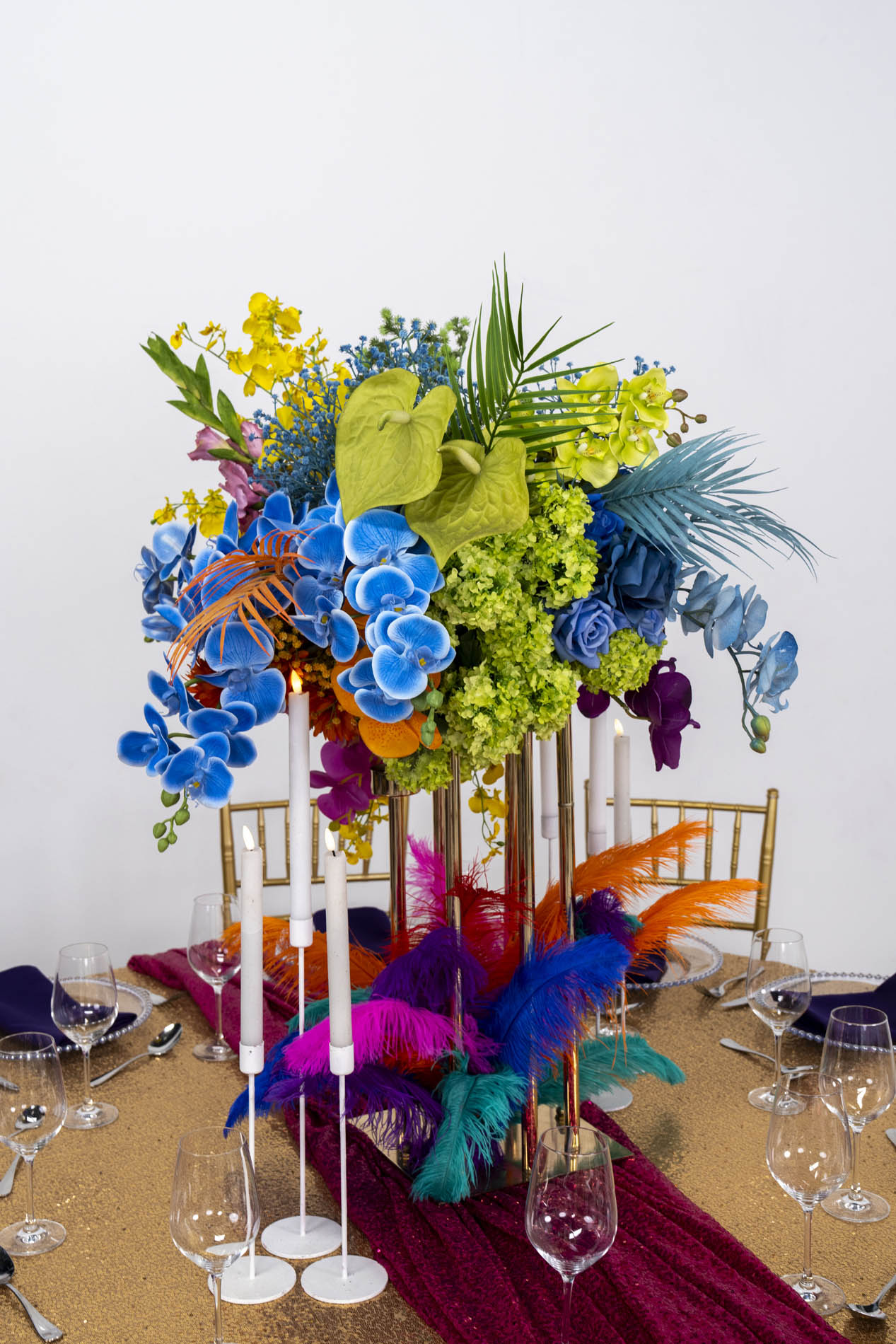 The centrepiece is a towering architectural masterpiece that commands the room. A gold multi-column pedestal stand supports a massive, lush arrangement of blue orchids, yellow dancing-lady orchids, green hydrangeas, and monstera leaves, accented by vibrant teal and orange fronds. Nested at the base of the columns is a second layer of texture: a cluster of large ostrich feathers in electric pink, purple, orange, and teal, creating a soft, feathered “burst” across the fuchsia runner.