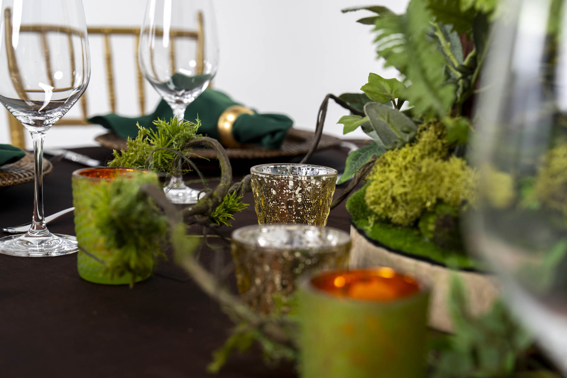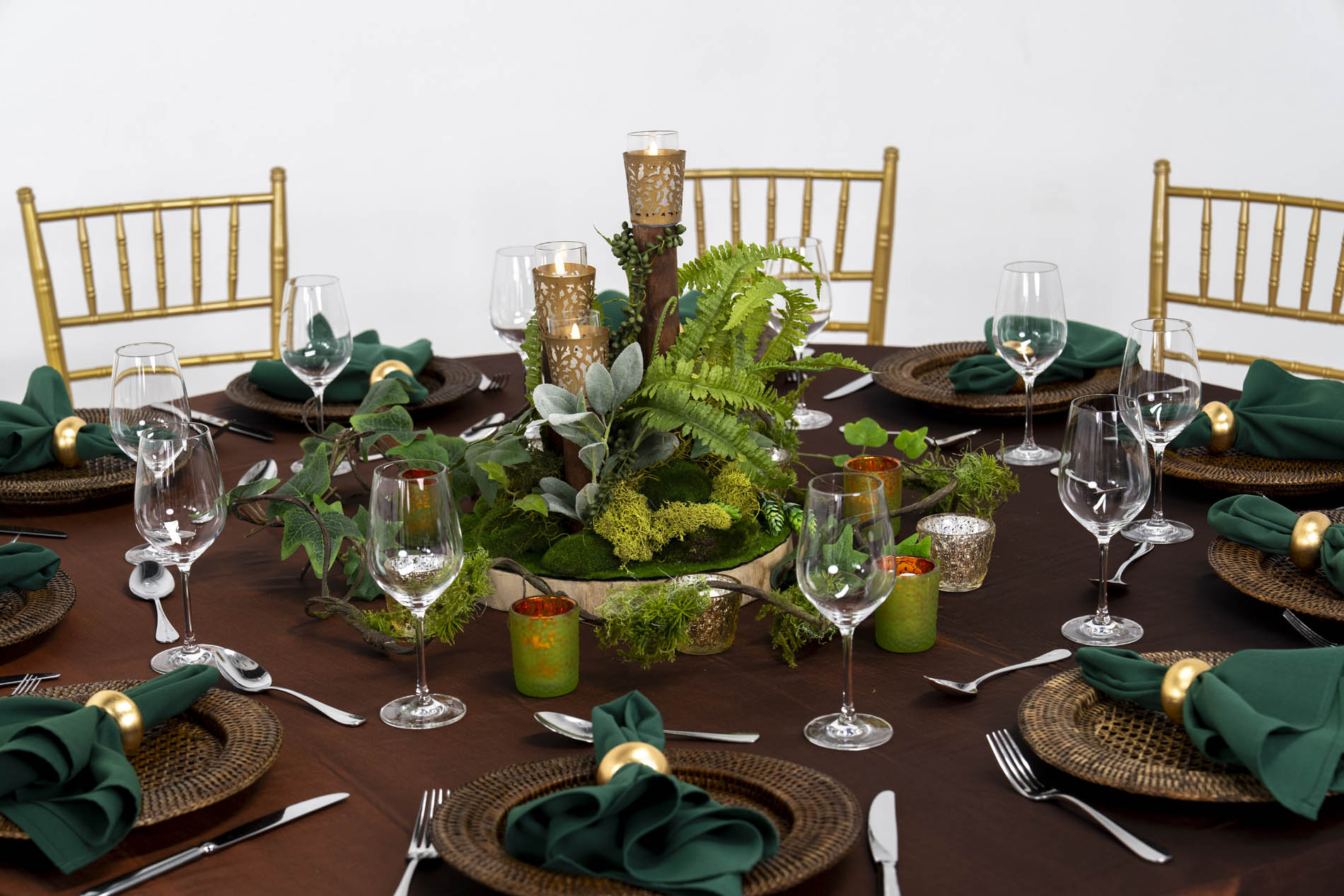 Each place setting is defined by a dark woven rattan charger plate, adding a rugged, tactile element to the table. Forest green napkins are cinched with bold gold ring holders, echoing the metallic accents found in the centrepiece and chairs. Polished silver cutlery and crystal-clear wine glasses provide a clean, modern finish to this otherwise wild and whimsical design.