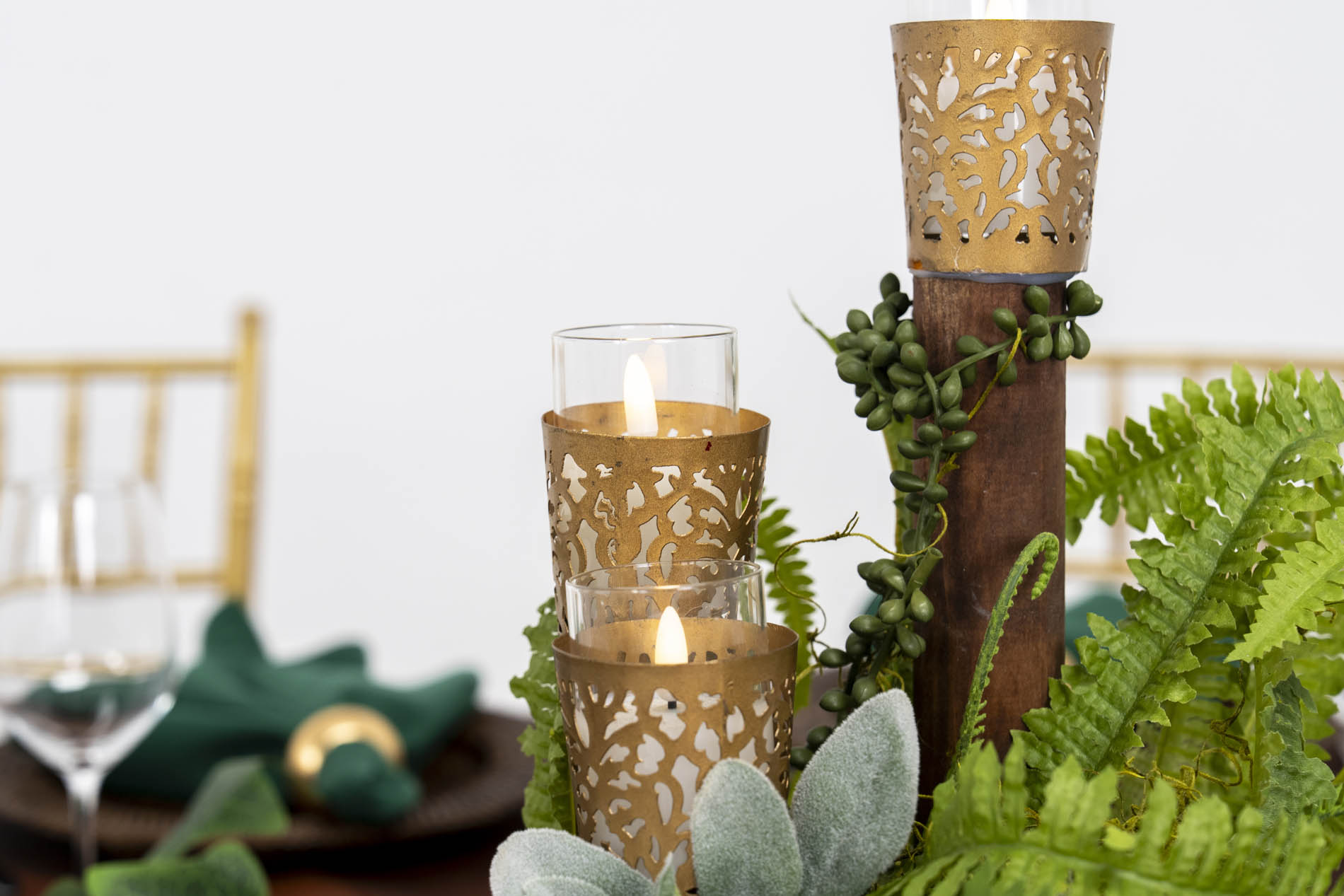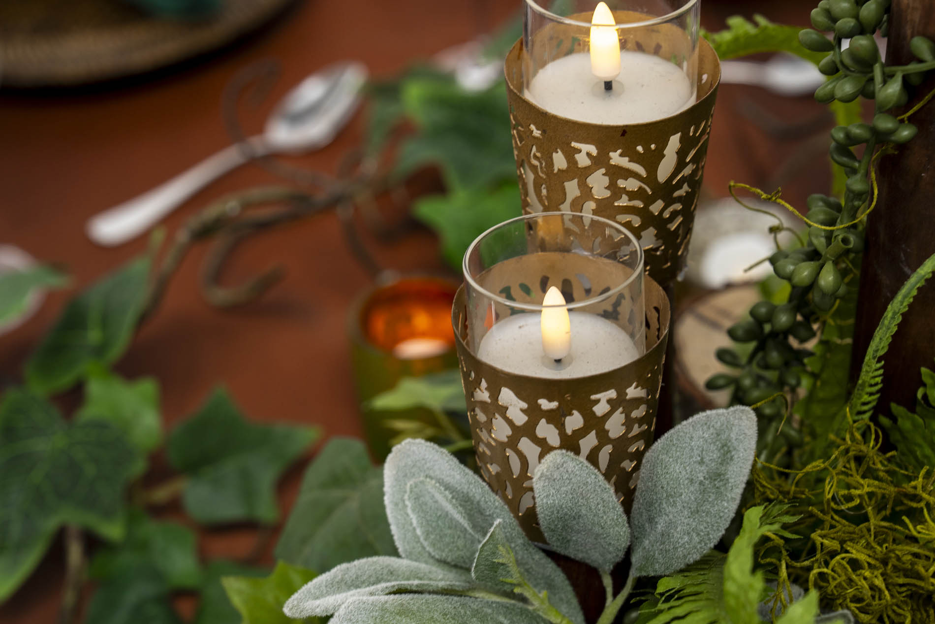 The centrepiece is a meticulously crafted woodland escape. Elevated on a natural wood slab, a cluster of moss-covered mounds, feathery ferns, and silver-leafed succulents create a tiered landscape of greenery. Reaching out from this core are winding vine-like branches and ivy that trail across the table, interspersed with gold laser-cut hurricane holders that cast a warm, flickering glow through their intricate patterns.