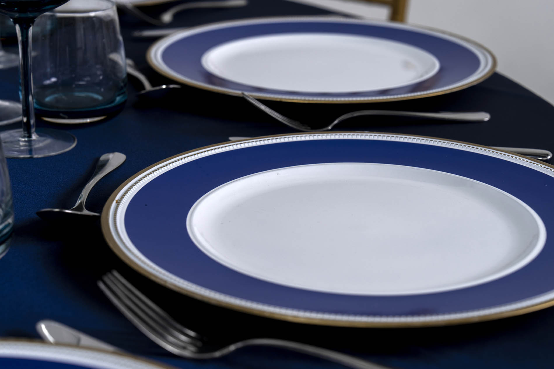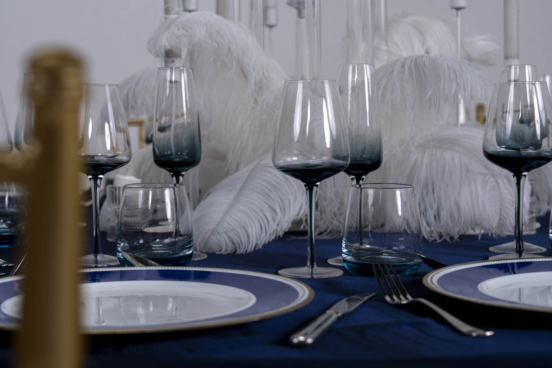 Each place setting is defined by a striking navy and white dinner plate, featuring a wide navy border with a delicate gold-rimmed edge. These plates act as a focal point, mirroring the table’s color story with precision. Ombré blue-tinted glassware—including tall-stemmed wine glasses and matching water tumblers—adds a gradient of color that reinforces the “frozen” aesthetic. Polished silver cutlery completes the setting with a clean, professional finish.