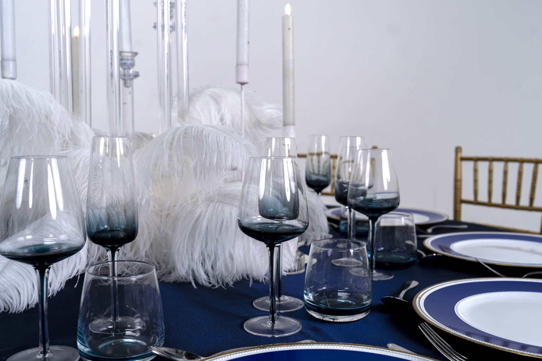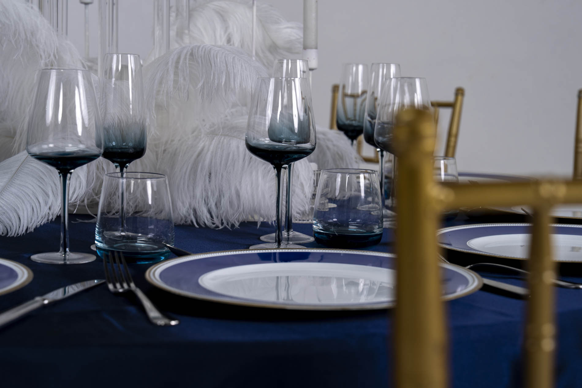 The foundation of the look is a navy blue satin tablecloth, draped to provide a rich, light-absorbing base that allows the white and glass elements to appear almost luminous. This deep, oceanic foundation is perfectly balanced by gold Tiffany chairs with sleek black cushions, adding a structural warmth and a touch of classical prestige to the cool-toned palette.