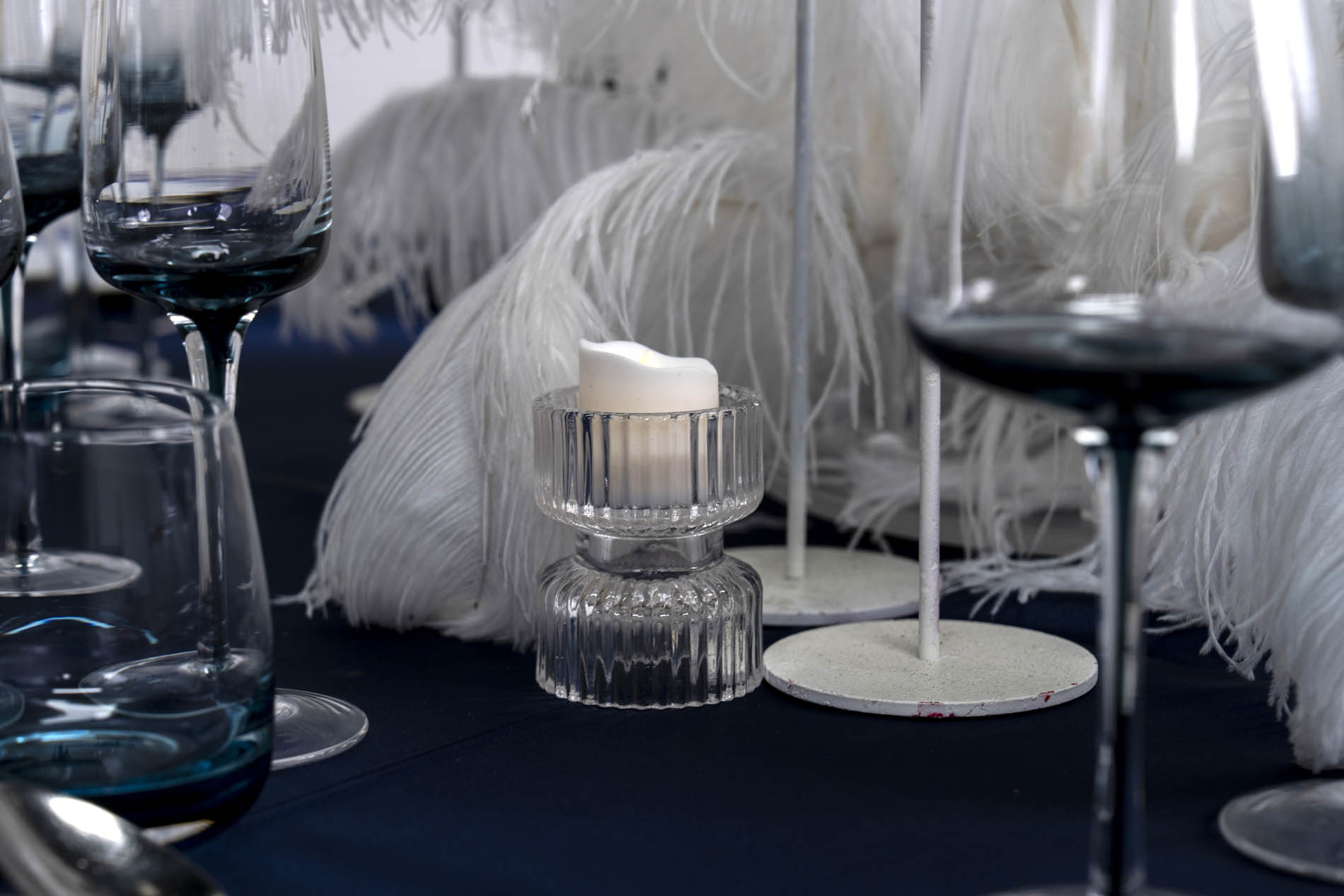 The centrepieces are a breathtaking collection of soaring clear acrylic candelabras in varying heights. These architectural pieces are designed to house slender white taper candles that seem to float above a base of lush white ostrich feathers. The feathers add a soft, cloud-like texture that mimics freshly fallen snow, creating a stunning visual contrast against the sharp lines of the acrylic towers.