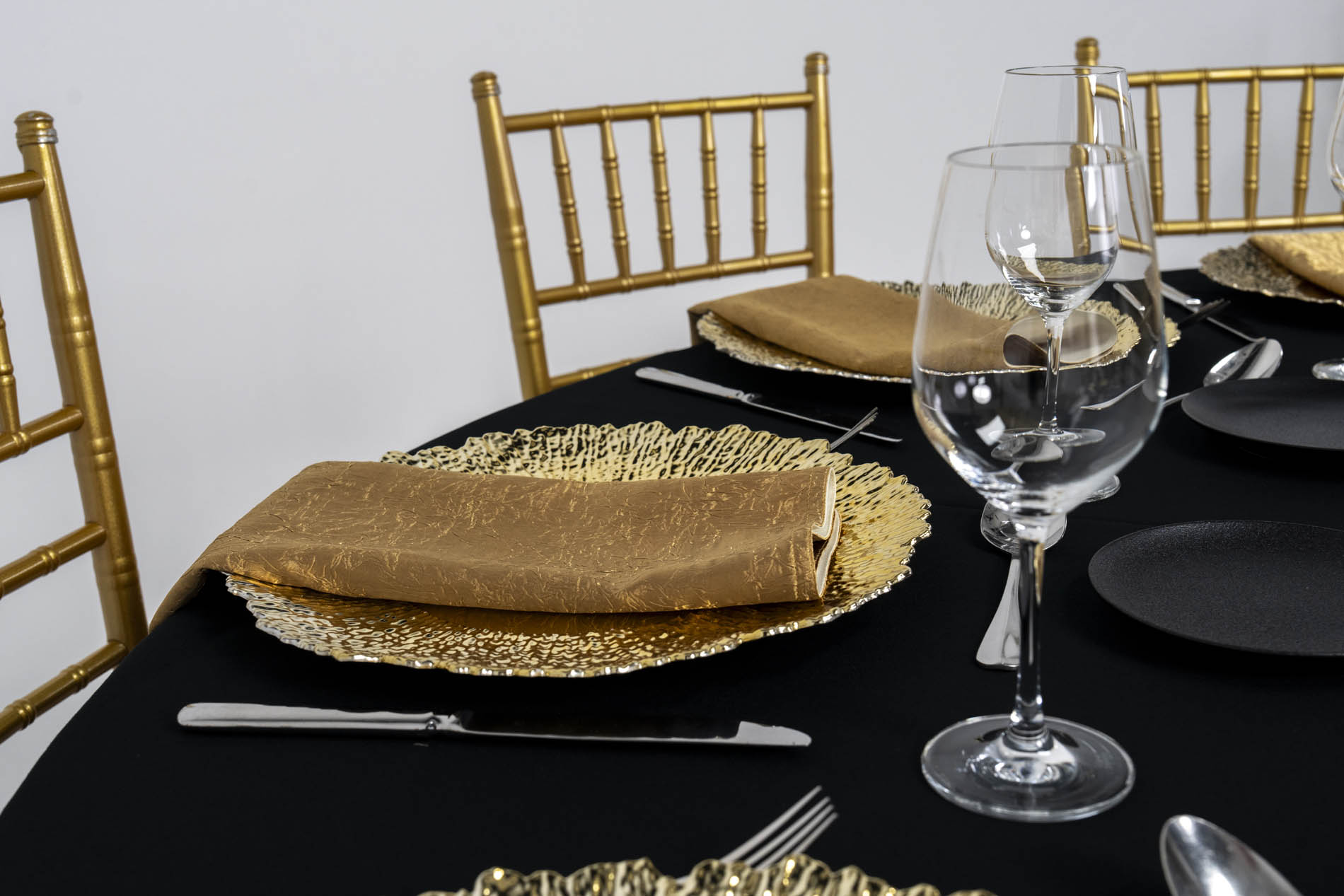 The foundation of the look is a matte black round tablecloth, providing a dense, dark base that allows every golden element to pop with maximum intensity. This striking canvas is perfectly balanced by gold Tiffany chairs with plush black cushions, anchoring the table with a sense of structural elegance and weight.