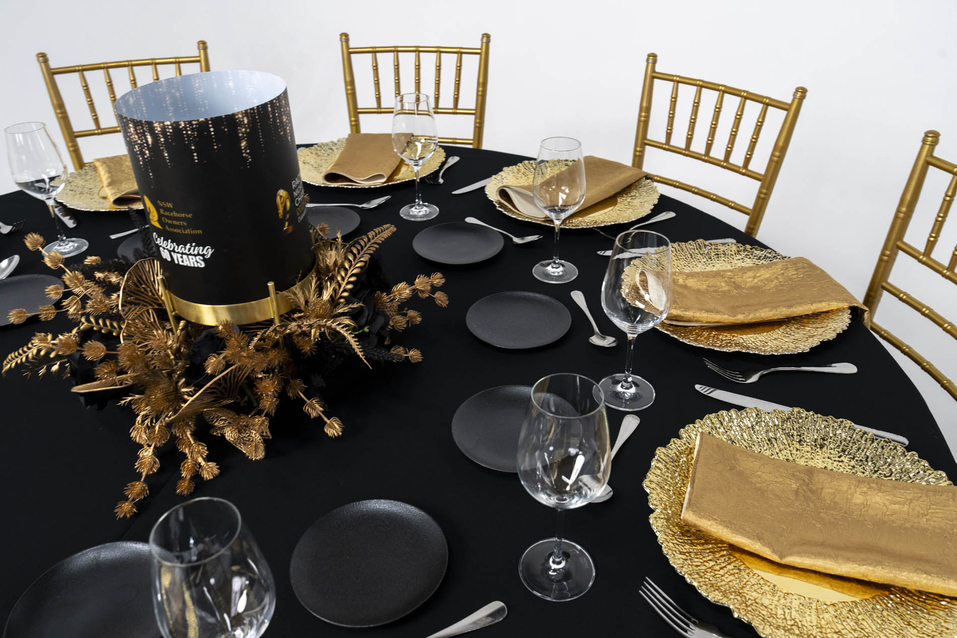 The centrepiece is a bespoke anniversary cylinder, custom-branded for the occasion and elevated on a gold stand. This architectural focal point is surrounded by a rich, textured wreath of gilded botanicals and black roses, blending dried golden ferns and thistles with dark, romantic florals. The arrangement is designed to create a sense of movement and “organic wildness” around the clean lines of the central vessel.