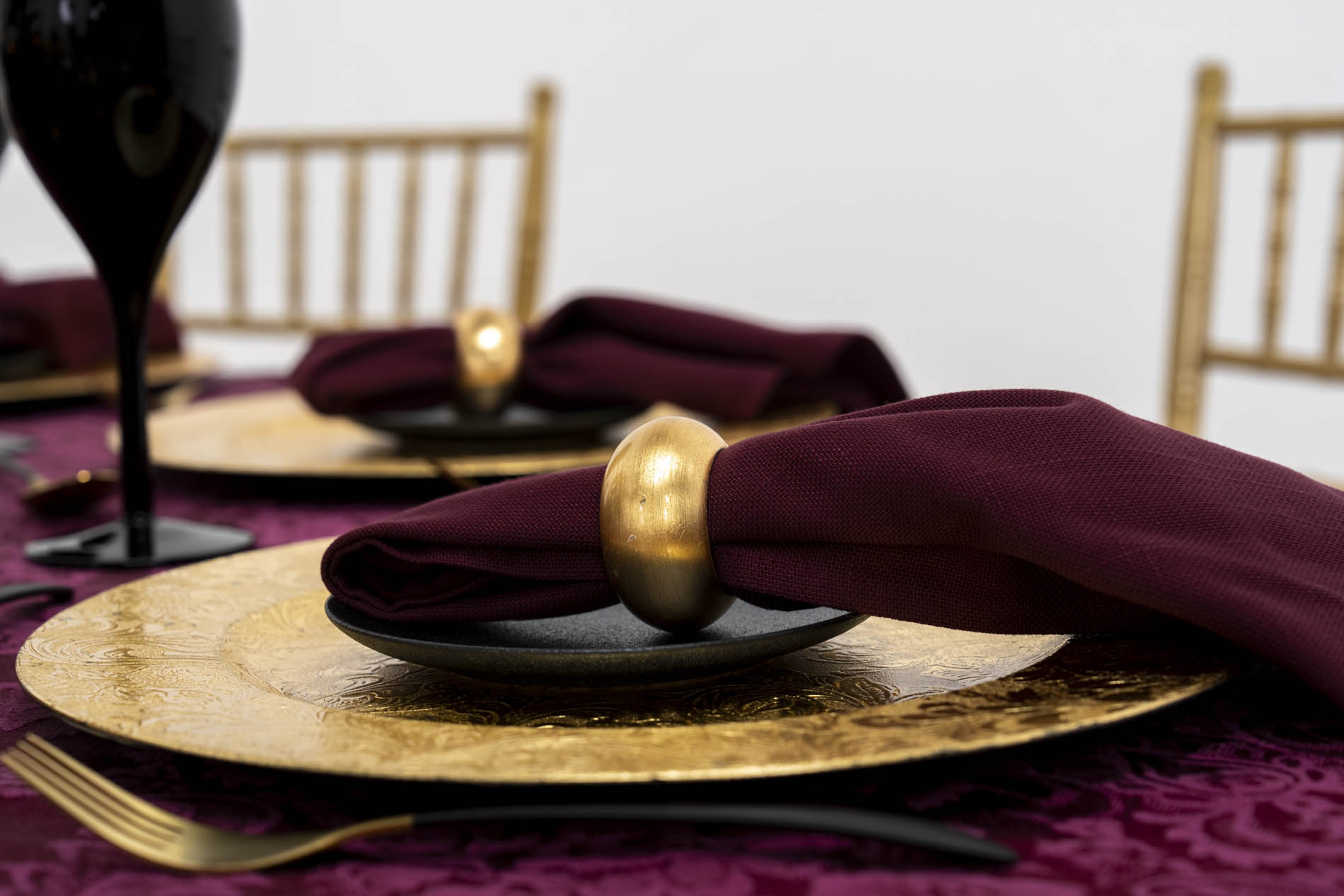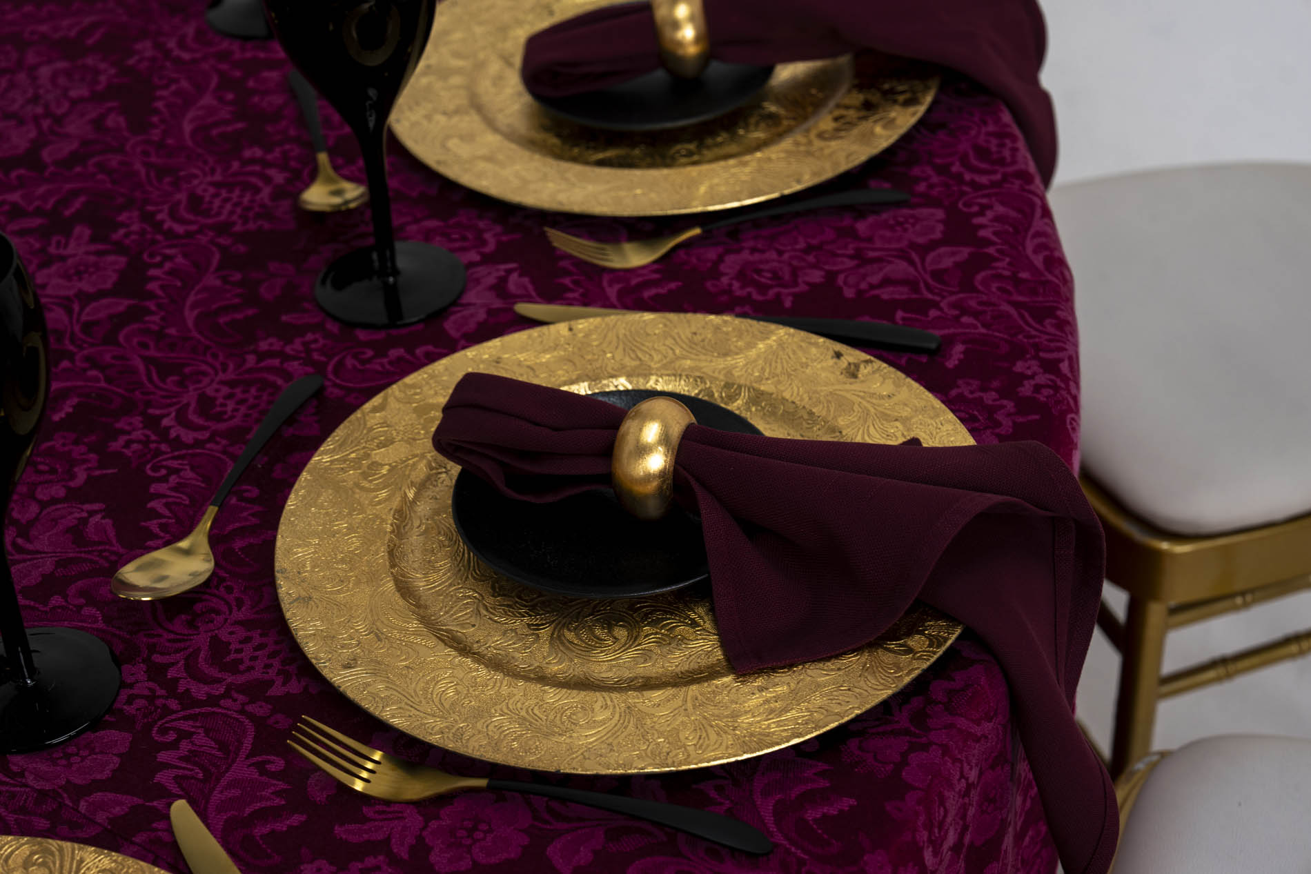 Each place setting is defined by a bold, ornate gold charger plate with an embossed floral filigree. These high-shine plates are layered with a matte black accent plate and deep burgundy napkins cinched in wide, rounded gold ring holders. Opaque black wine goblets and modern black-handled flatware with gold heads complete the look, ensuring the “Venetian Vamp” theme is carried through to every guest’s individual experience.