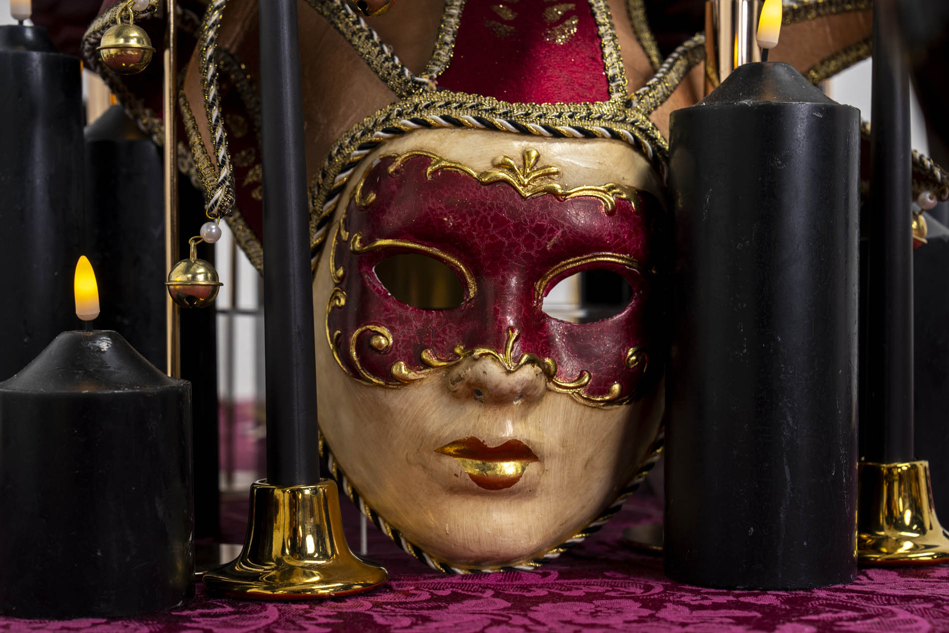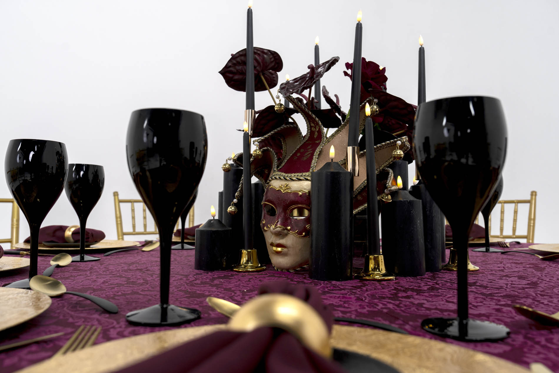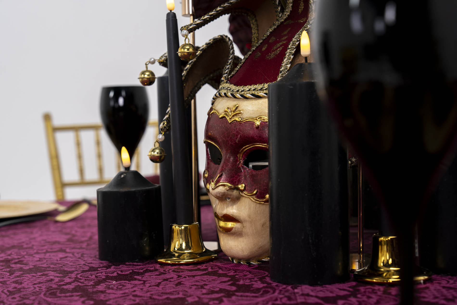 The centrepiece is a theatrical tribute to Venetian artistry. Housed within a cluster of matte black pillar candles of varying heights is a striking focal point: a burgundy masquerade mask, adorned with bells and intricate gold braiding. Emerging from behind the mask are dark, architectural blooms including deep red anthuriums and roses, interspersed with sleek black taper candles in gold holders to cast a ritualistic, flickering glow.