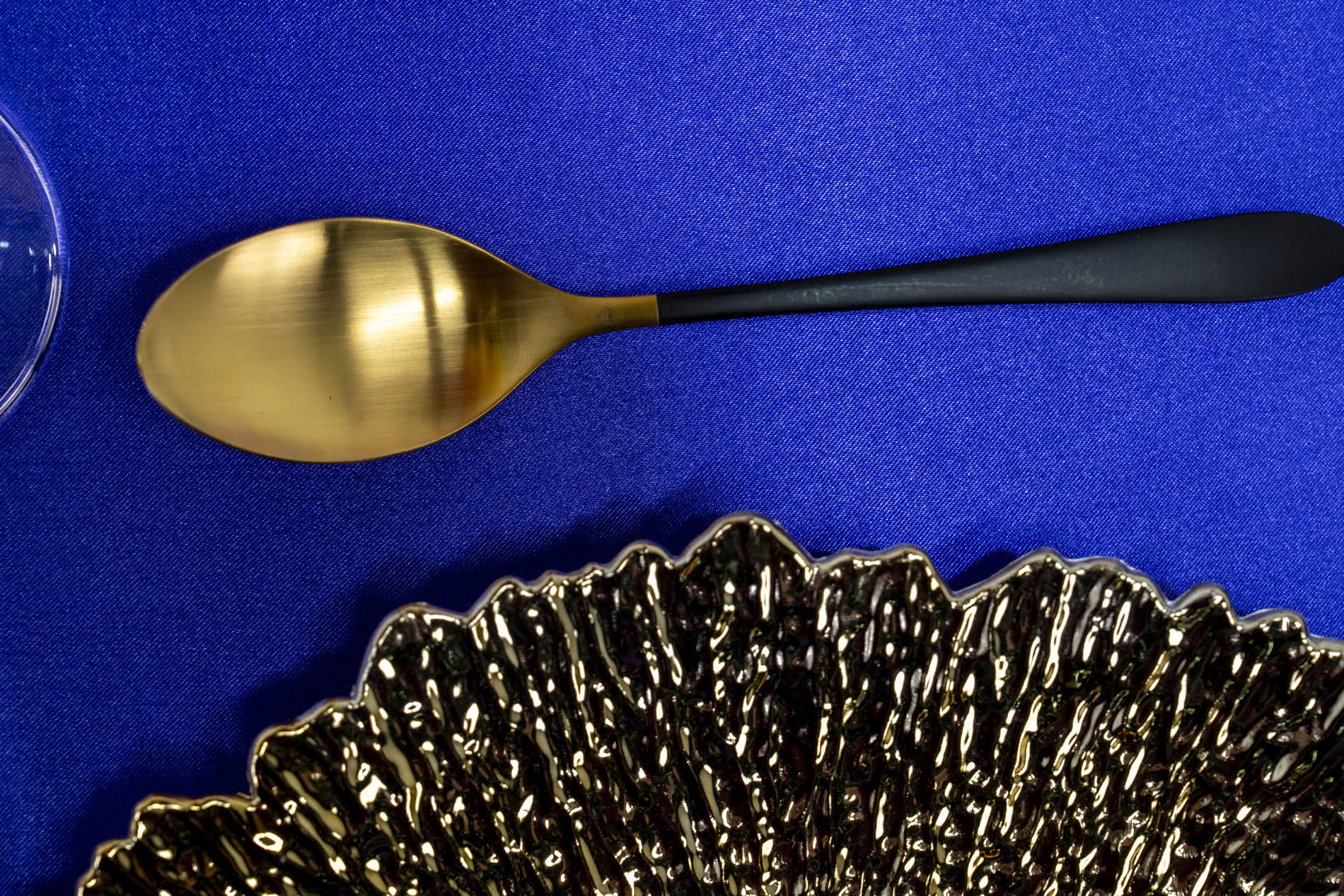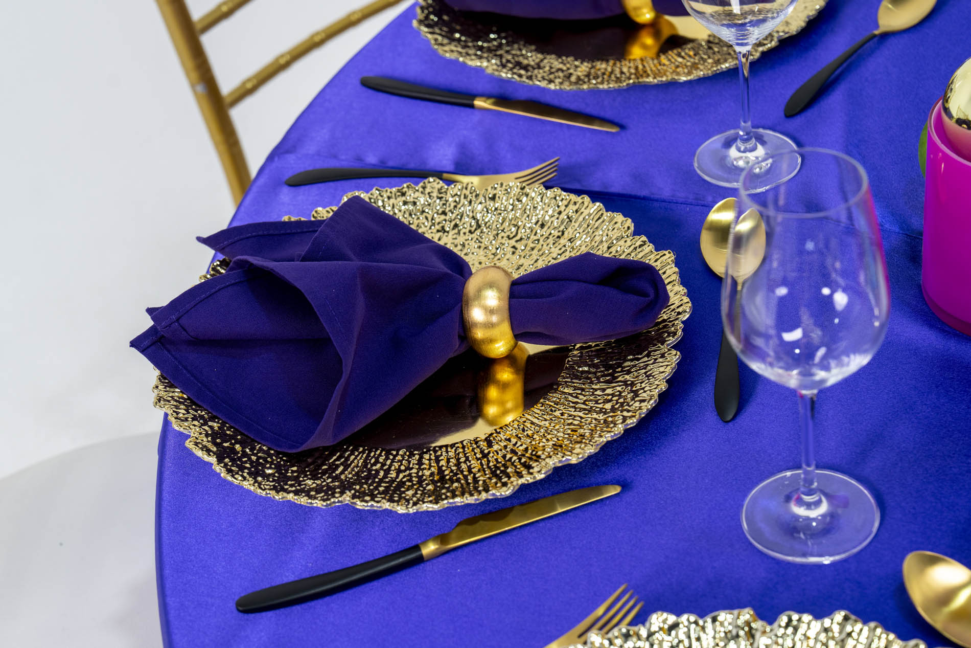 Each place setting is defined by a high-shine gold “crinkle” textured charger plate, which catches the light with a modern, liquid-metal effect. Atop these sit deep purple napkins, folded neatly and secured with thick, rounded gold napkin rings for a prestigious finish. Gold and black modern flatware and clean stemmed glassware complete the setting, ensuring the table remains firmly rooted in high-end luxury.