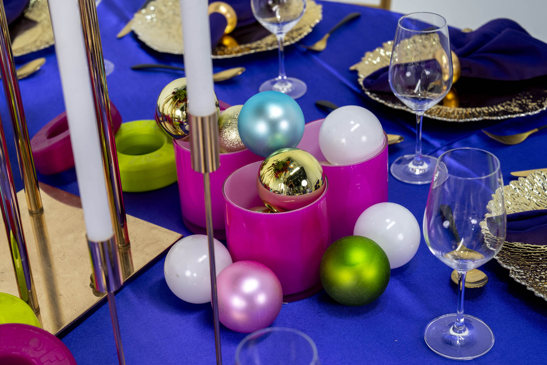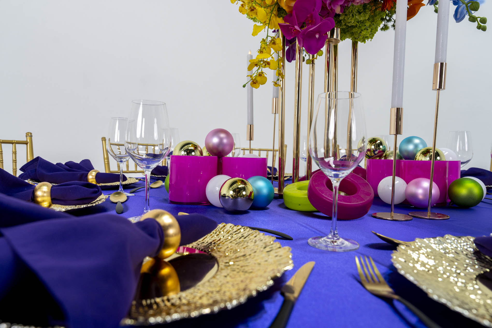 The foundation of the look is a rich, royal purple satin tablecloth, providing a high-contrast base that makes every other colour on the table appear to “vibrate” with intensity. This deep, luxurious base is perfectly balanced by gold Tiffany chairs with crisp white cushions, adding a touch of classic architecture and a bright frame to the vibrant, maximalist palette.