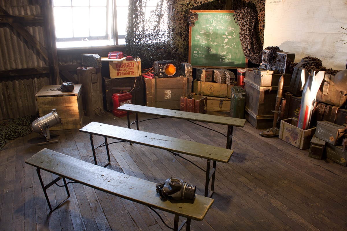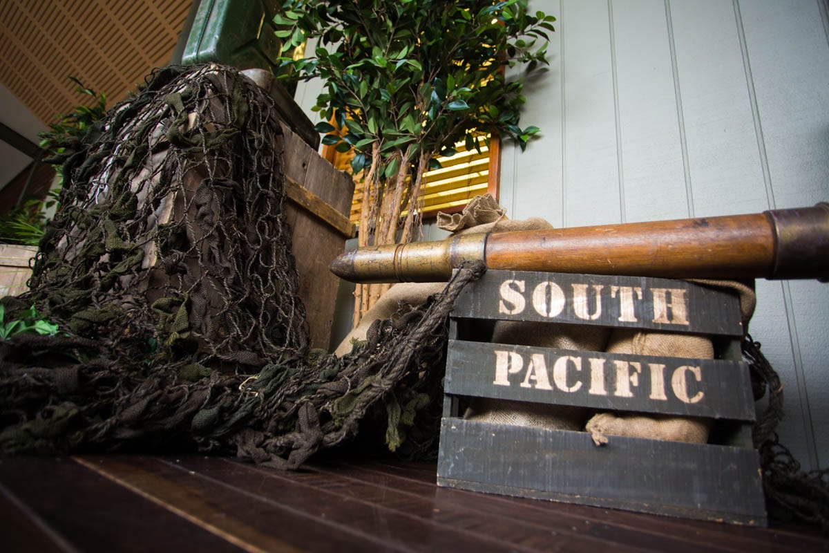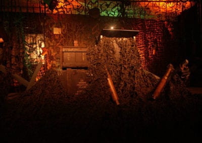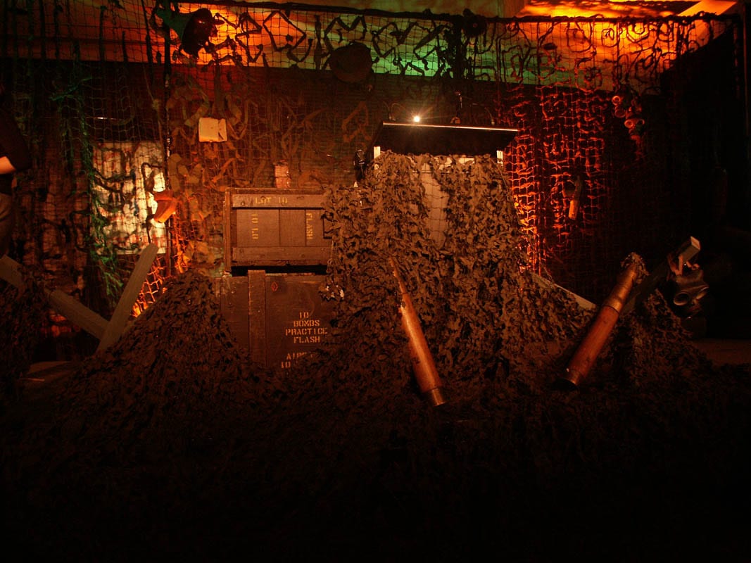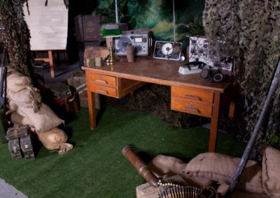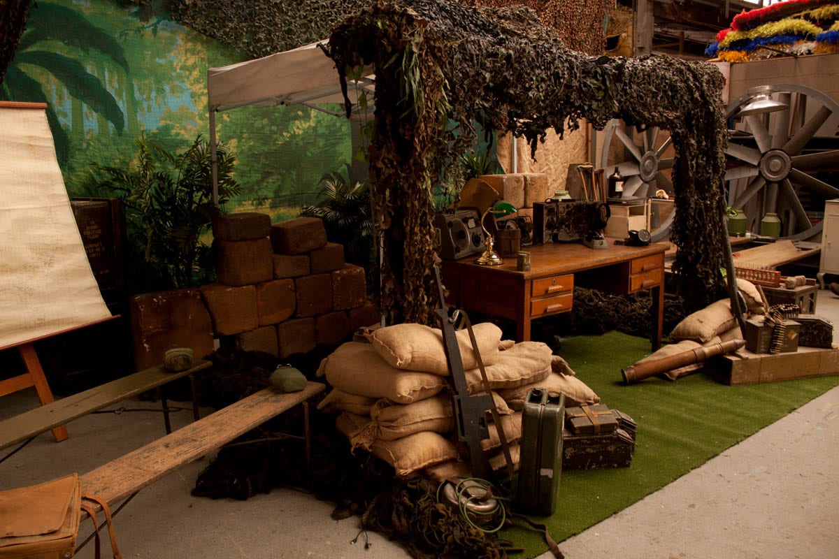 Our army theme sets the scene – a command post last century; tents and camouflage netting, sandbags and canisters, jerry cans, crates and boxes, ordinance, first aid equipment and large industrial fan set pieces. In the background we see jungle backdrops and foliage.