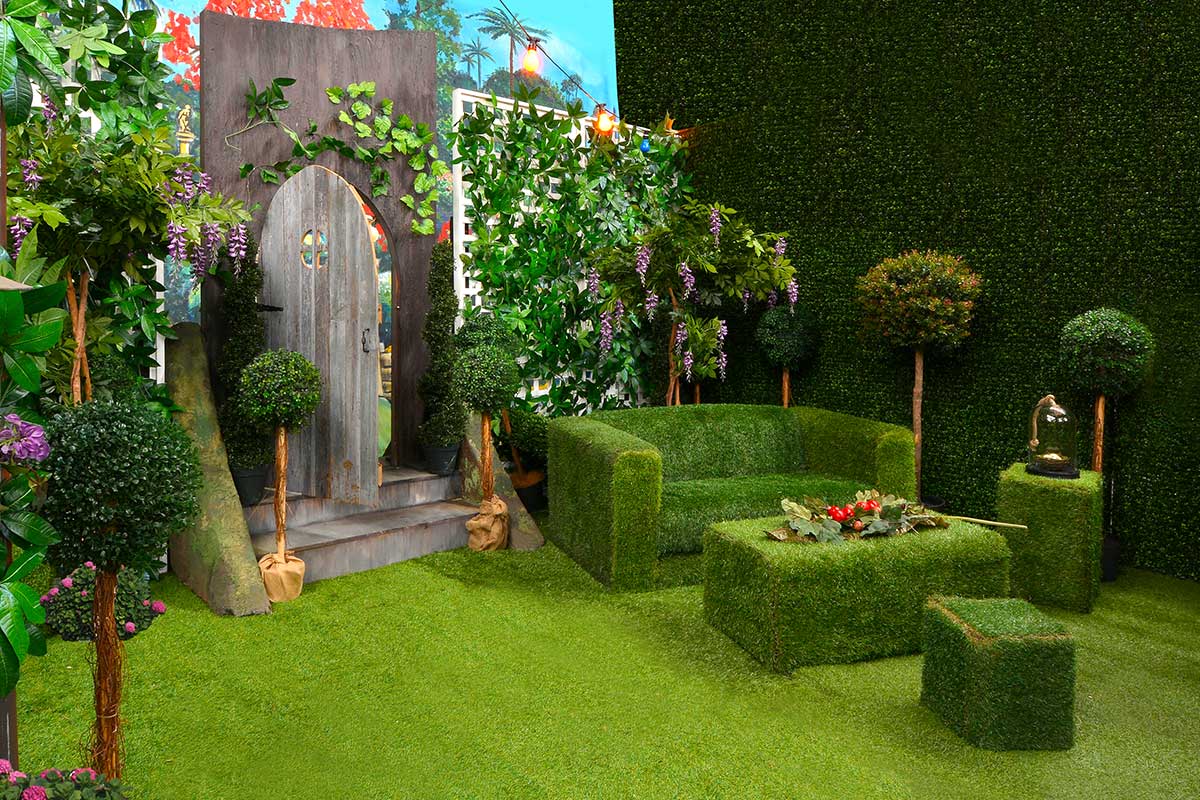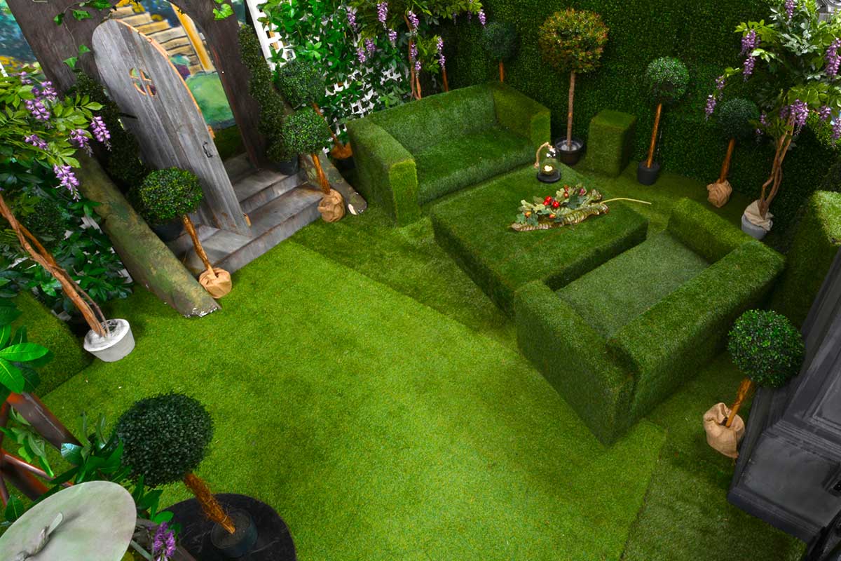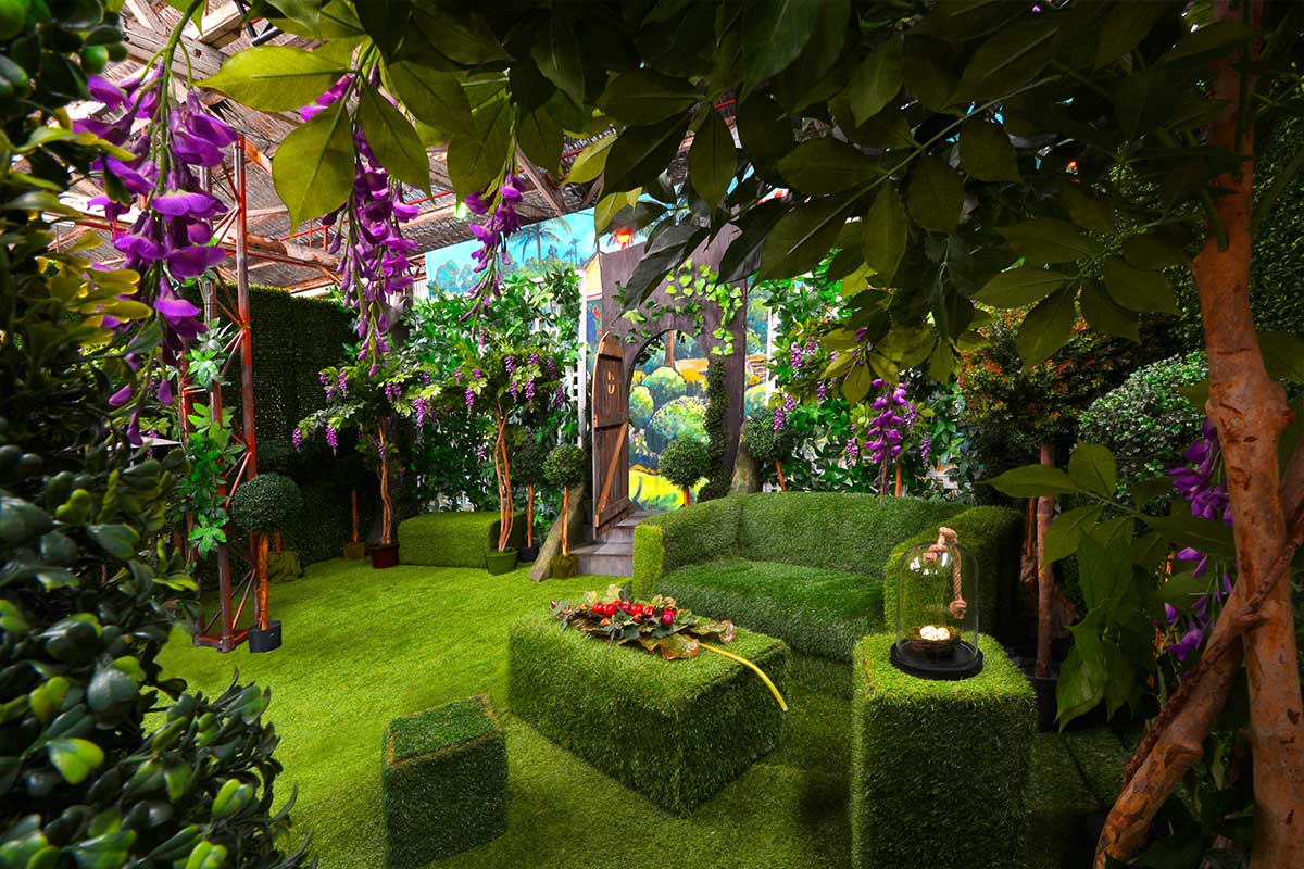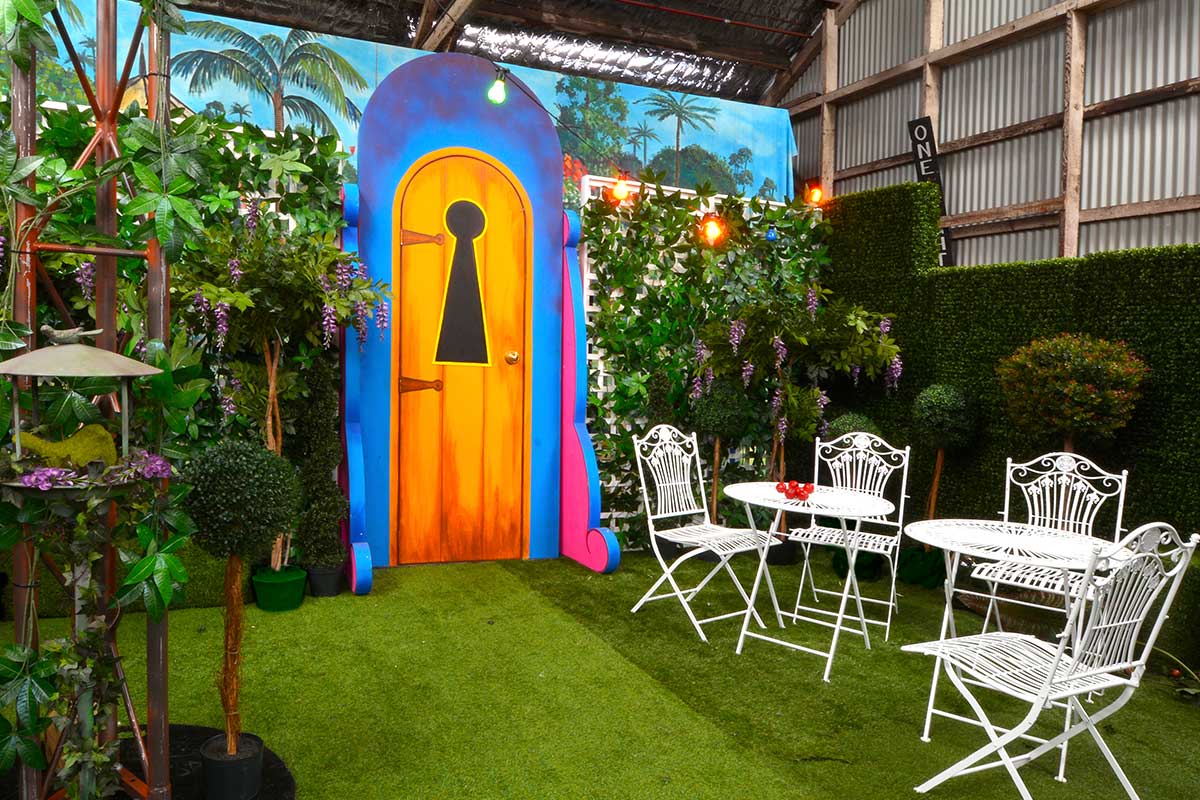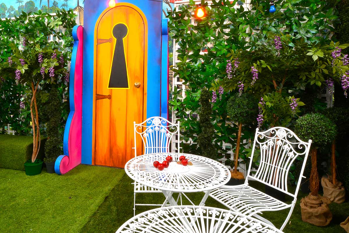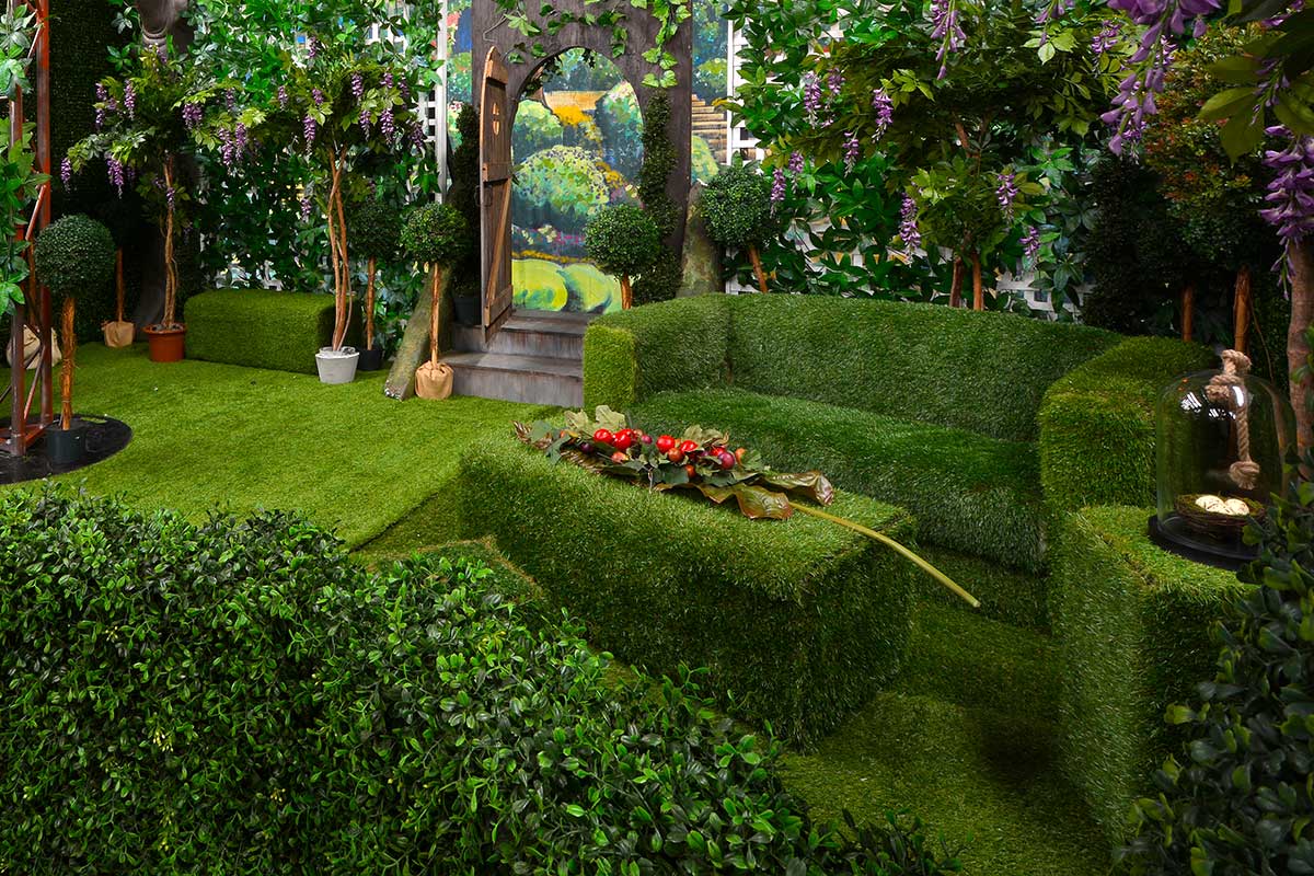 We have the key to unlock the gate – and through them we go, you and I, holding hands as we once more become children, curiosity and anticipation in our eyes – we’re ready to explore. Hey this garden sits on grass – and look, the grass has grown up and over shapes to form furniture. Over there, that’s topiary poking it’s head up – why, they’re everywhere. And hedgerows for walls, how cool! Is that a magical door over there under those hanging garlands?