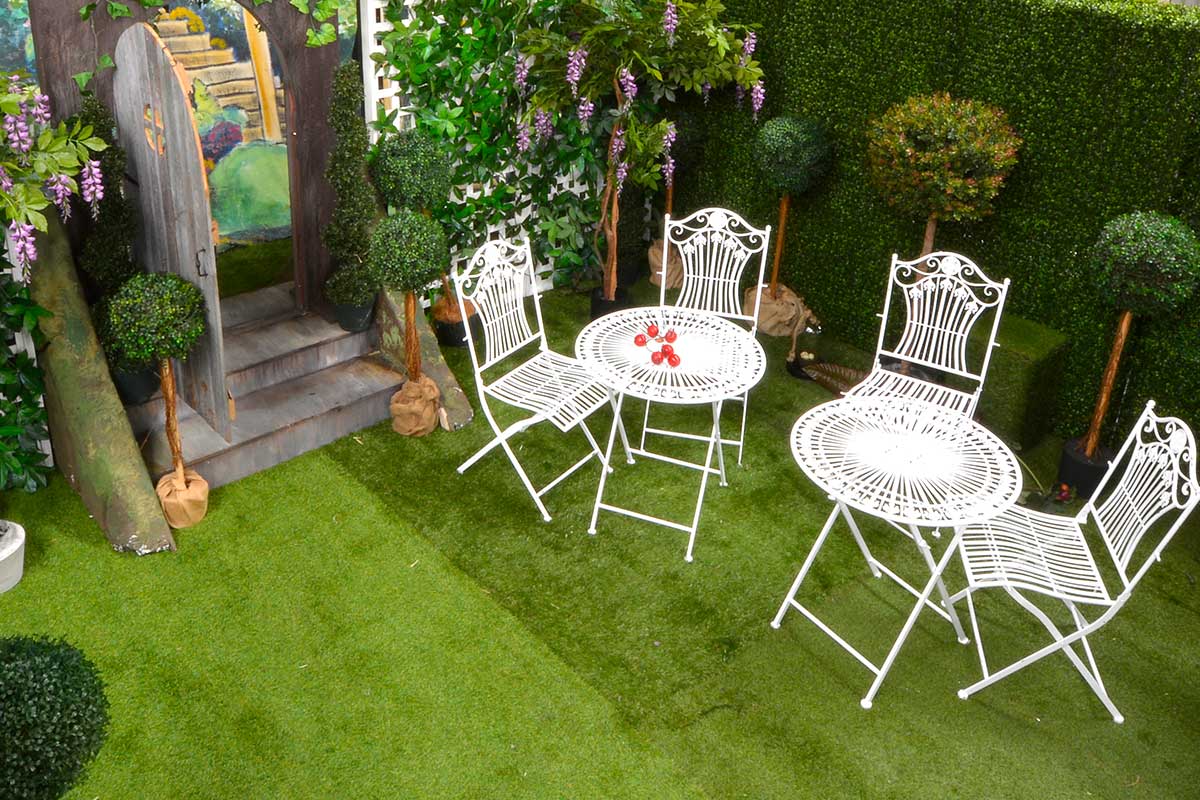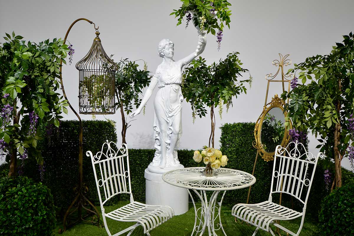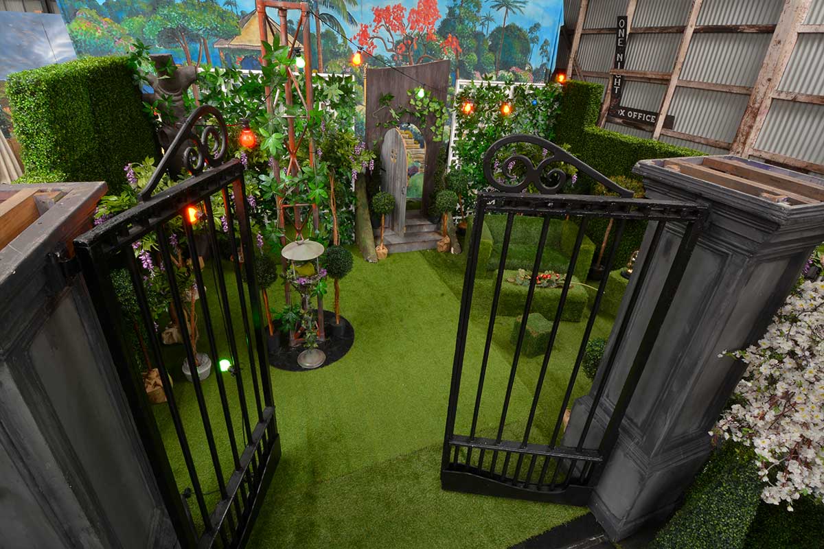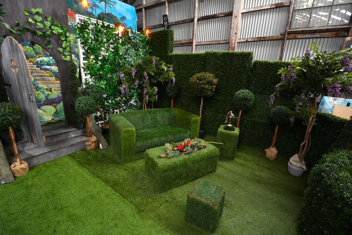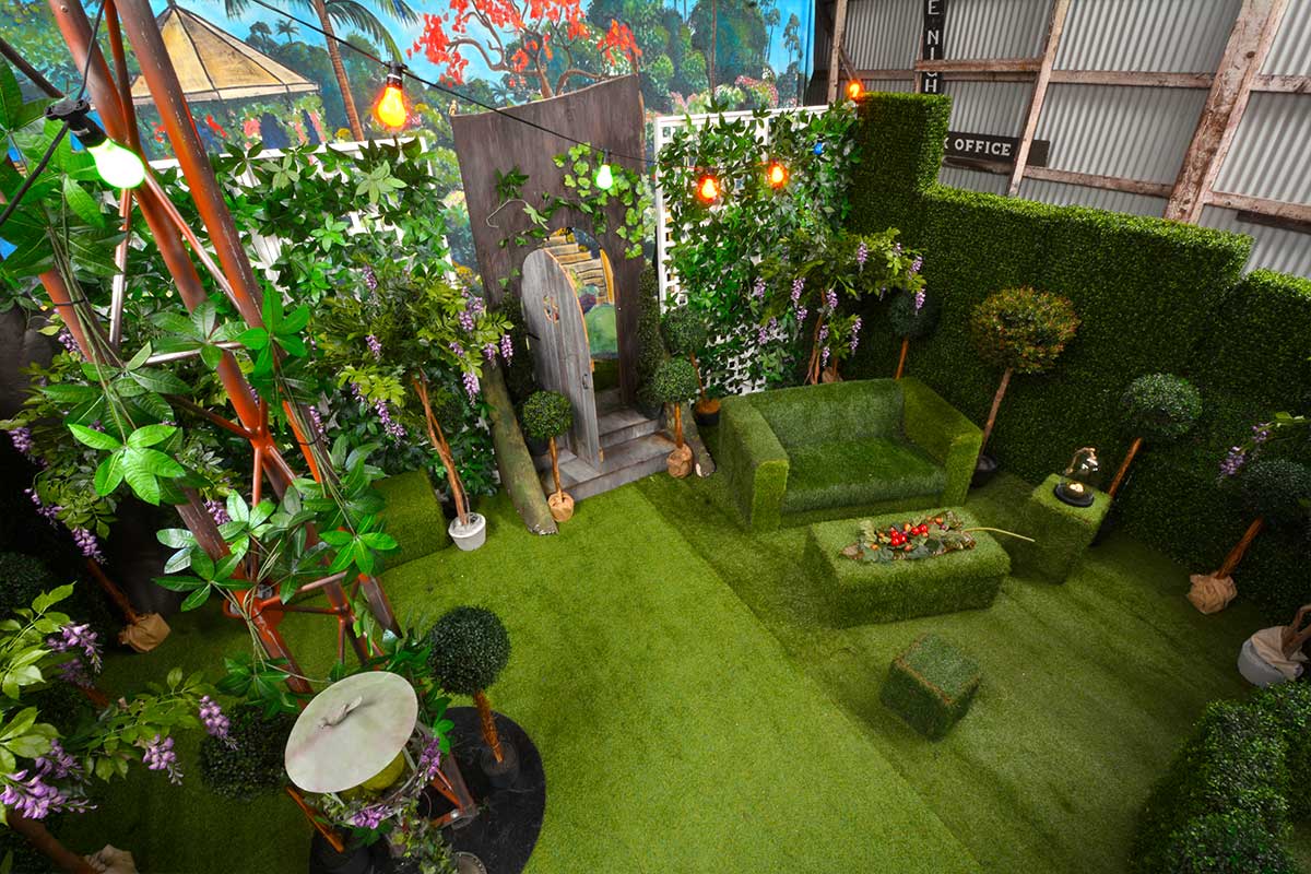 We have the key to unlock the gate – and through them we go, you and I, holding hands as we once more become children, curiosity and anticipation in our eyes – we’re ready to explore. Hey this garden sits on grass – and look, the grass has grown up and over shapes to form furniture. Over there, that’s topiary poking it’s head up – why, they’re everywhere. And hedgerows for walls, how cool! Is that a magical door over there under those hanging garlands?