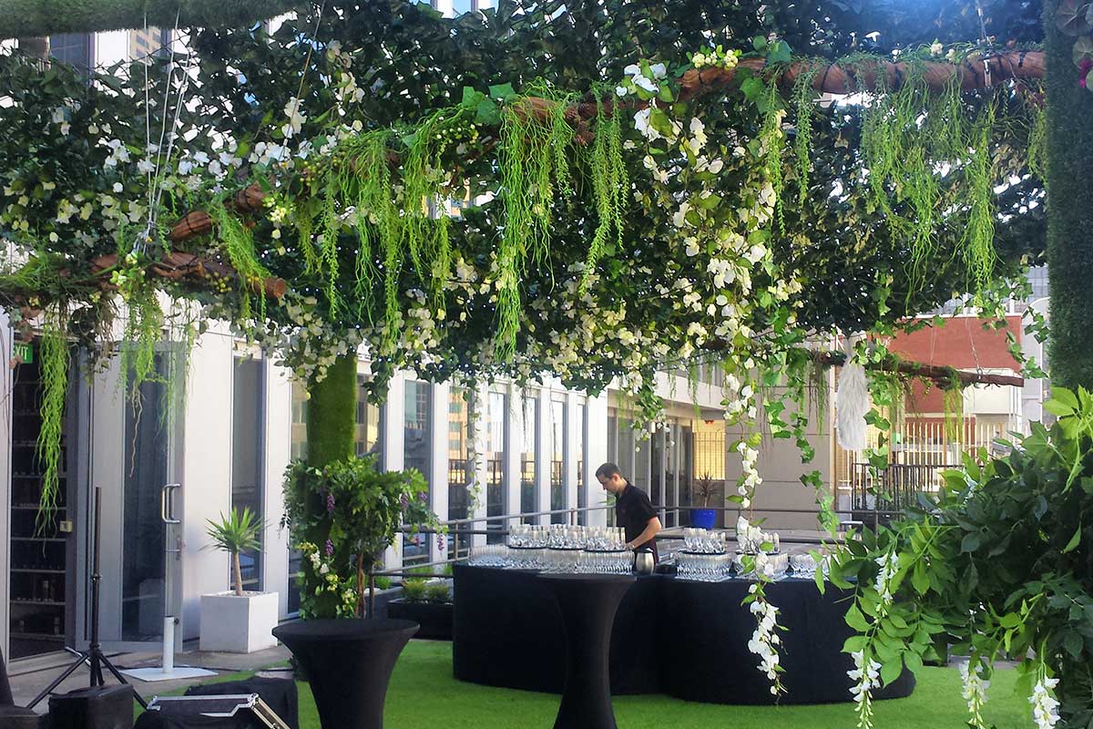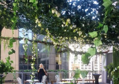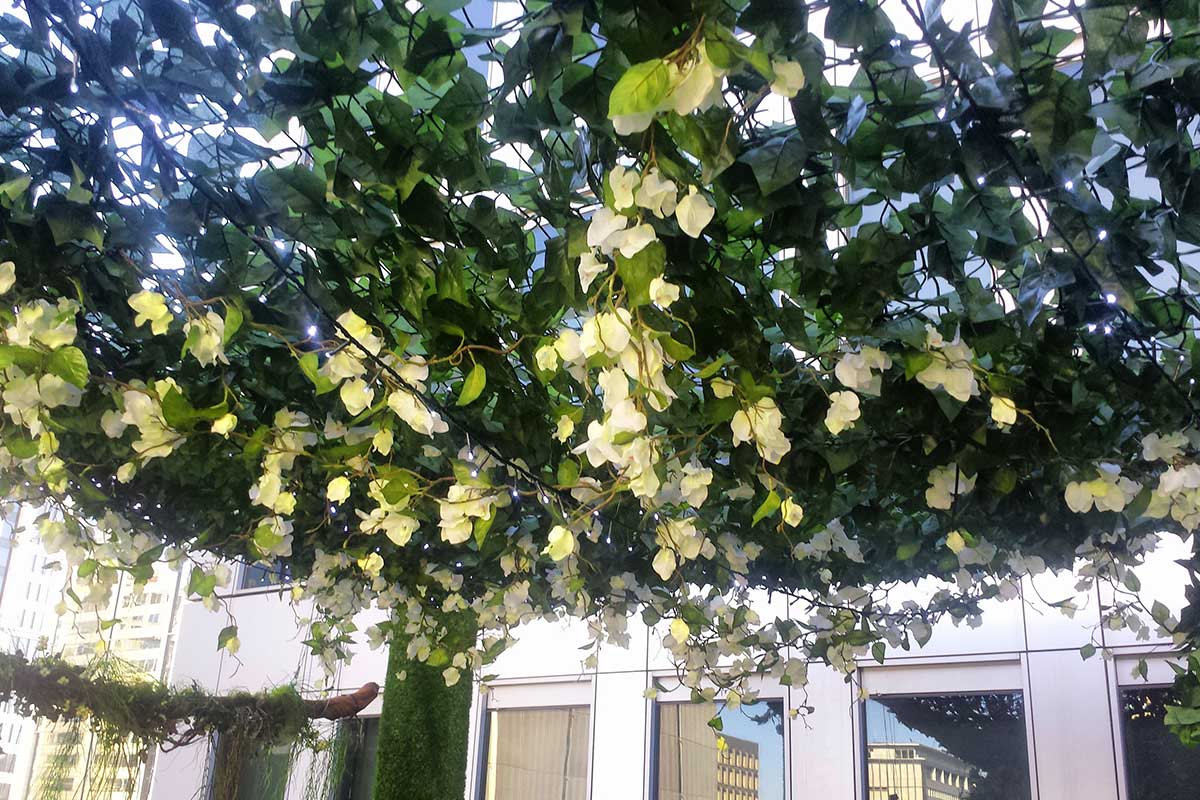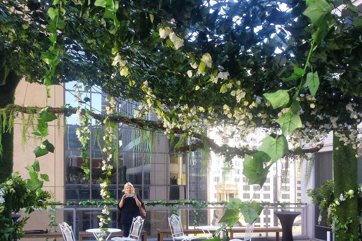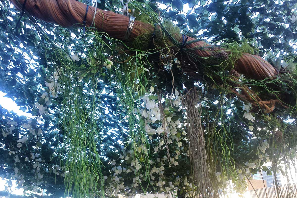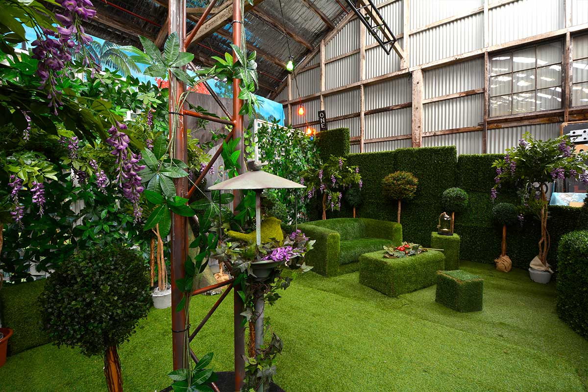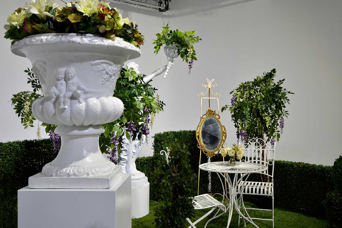 We have the key to unlock the gate – and through them we go, you and I, holding hands as we once more become children, curiosity and anticipation in our eyes – we’re ready to explore. Hey this garden sits on grass – and look, the grass has grown up and over shapes to form furniture. Over there, that’s topiary poking it’s head up – why, they’re everywhere. And hedgerows for walls, how cool! Is that a magical door over there under those hanging garlands?