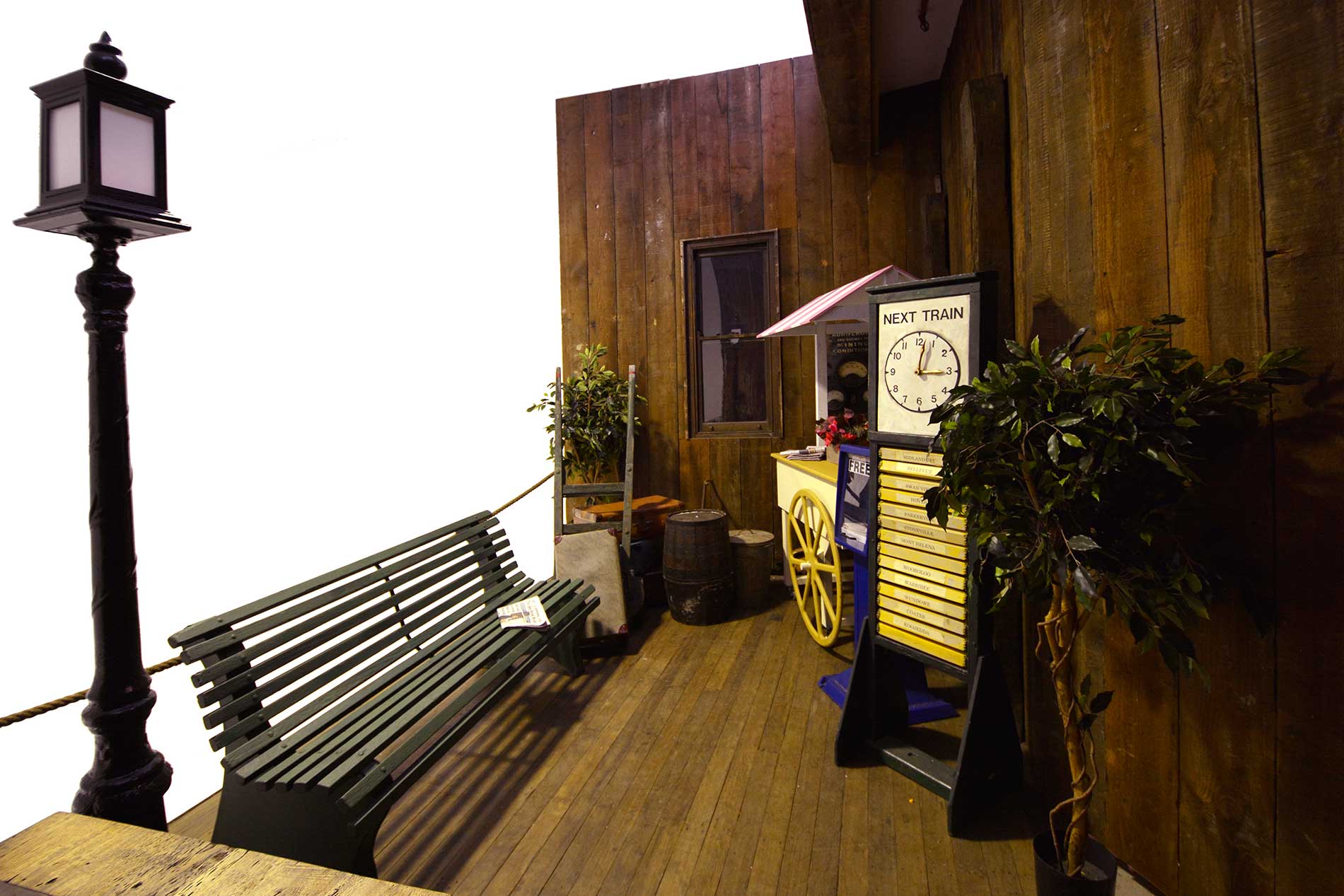 Before you hop on board the train you get to the railway station where all the traffic moves around the platform and travelers are hustling and bustling to get to their destinations. Featured props in this theme include street lamps, park benches, carts and a train departure board..