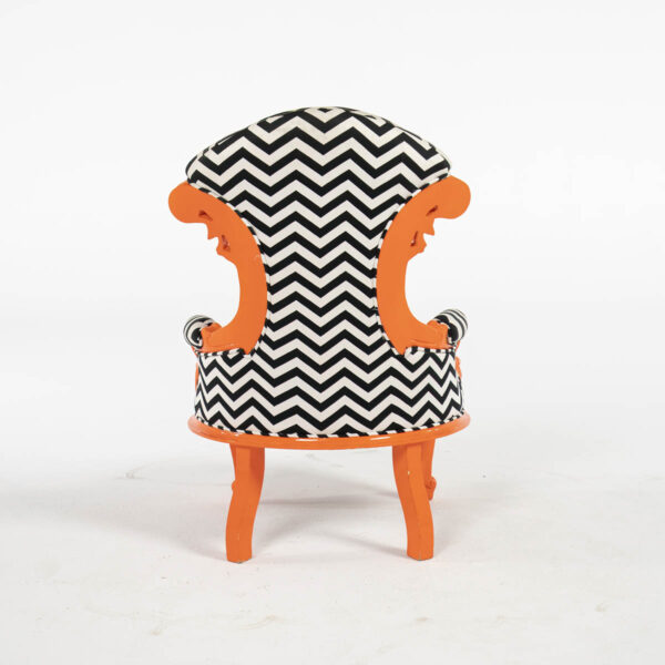 Alice Chair – Black and white zig-zag pattern on cushion seat, back and armrest with orange coloured frame.
