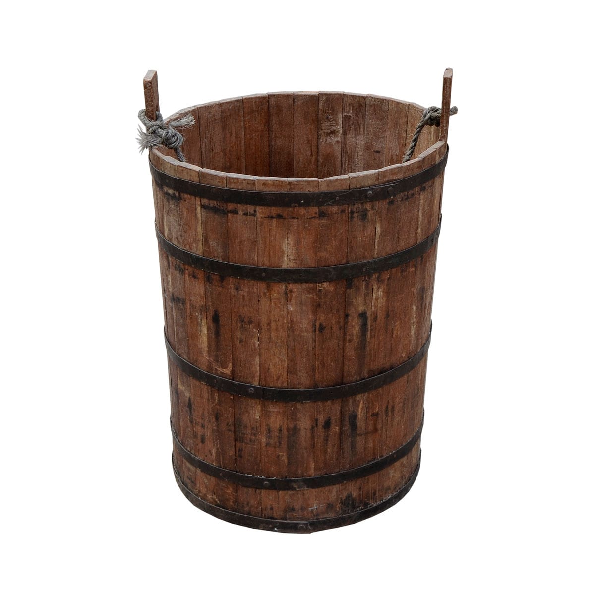 Wooden peasant bucket with metal banding and handles
