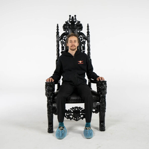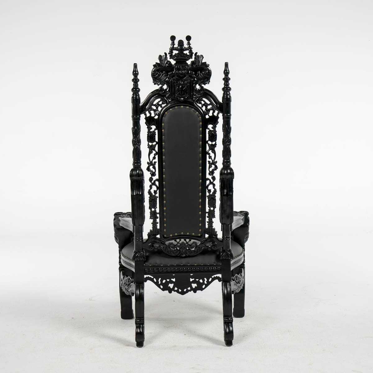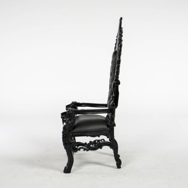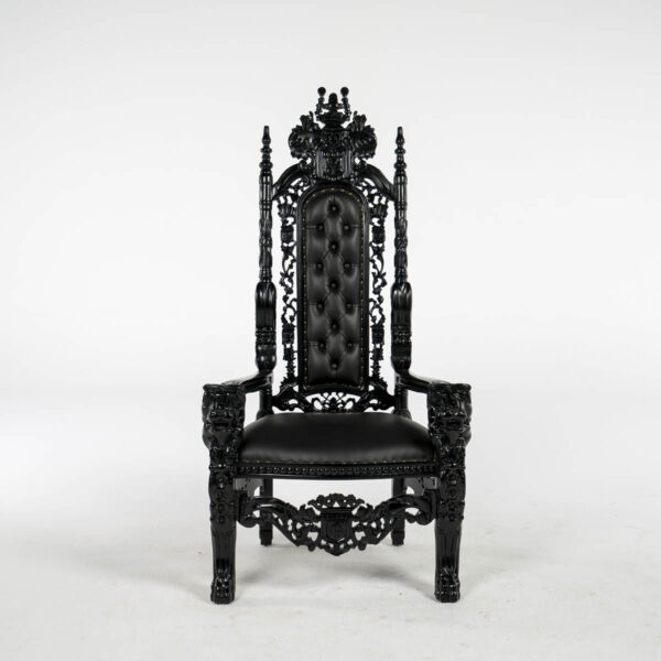 Black Throne – ornate high back cushioned throne. throne frame and material all in black colour.