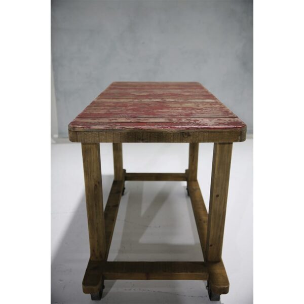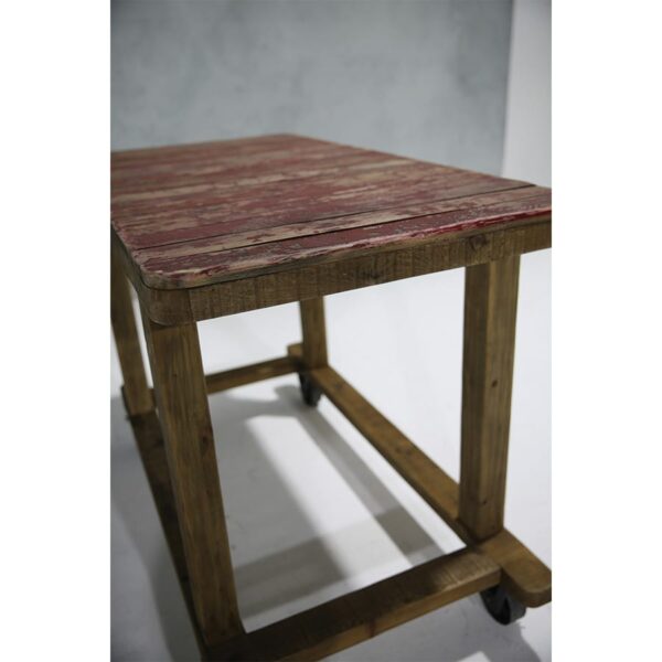 Features rustic painted red timber with one directional wheels (they do not swivel). Great for use as bar service, display or table.