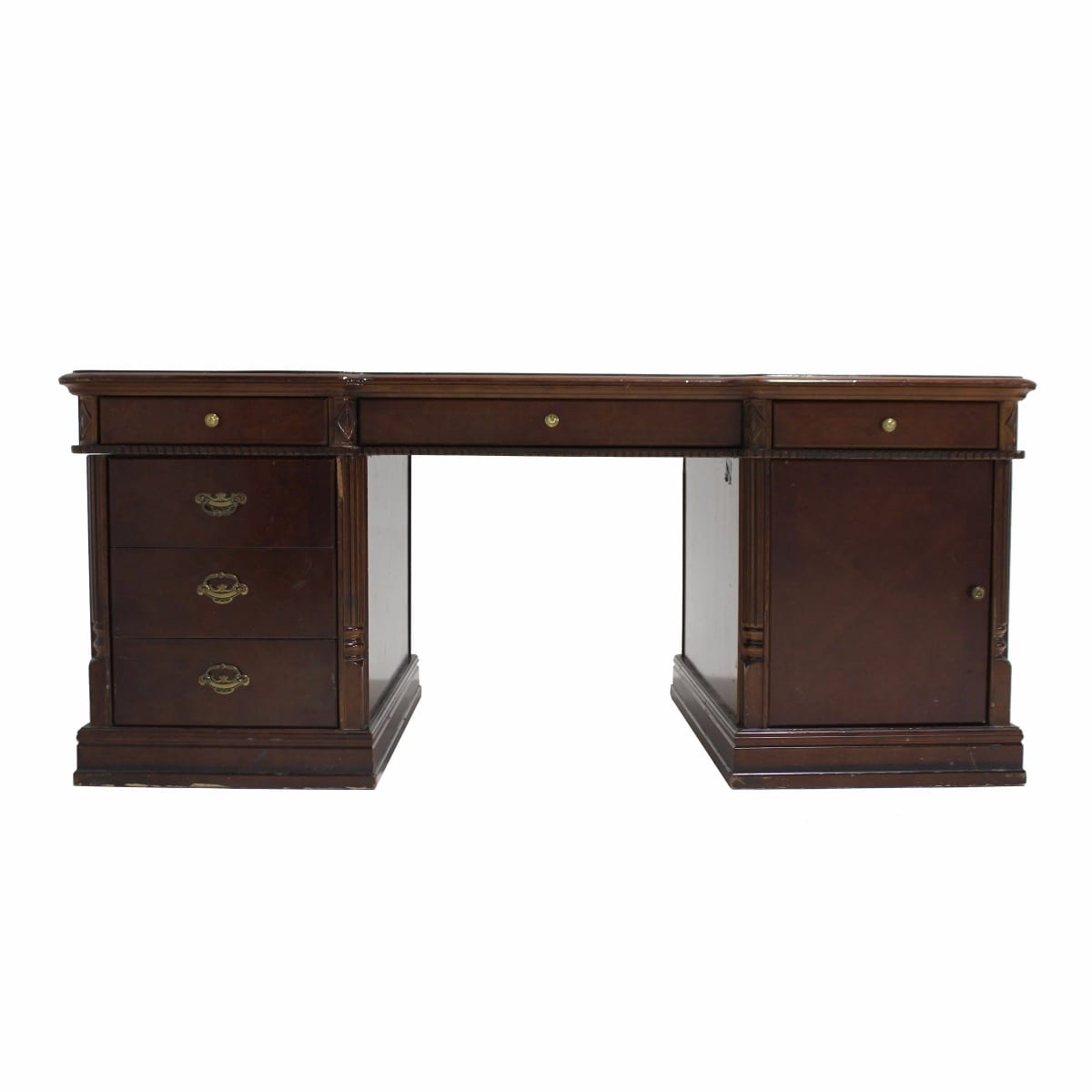 Courtroom style, dark stained timber finish, with metal drawer handles. Comes in 3 sections.