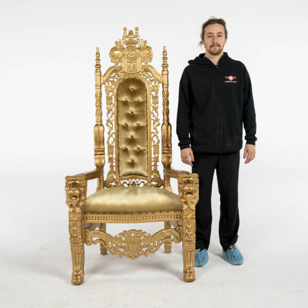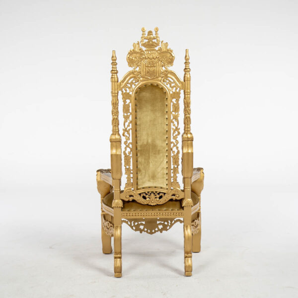 Gold Throne – ornate high back cushioned throne. throne frame and material all in gold colour.