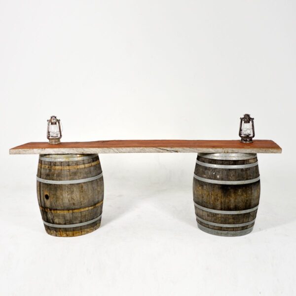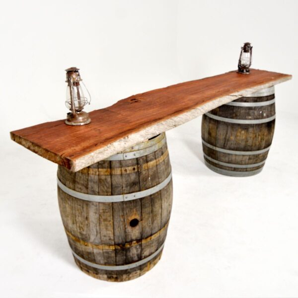 Raw Timber Table Top on Two Barrels - prop / event decor for hire