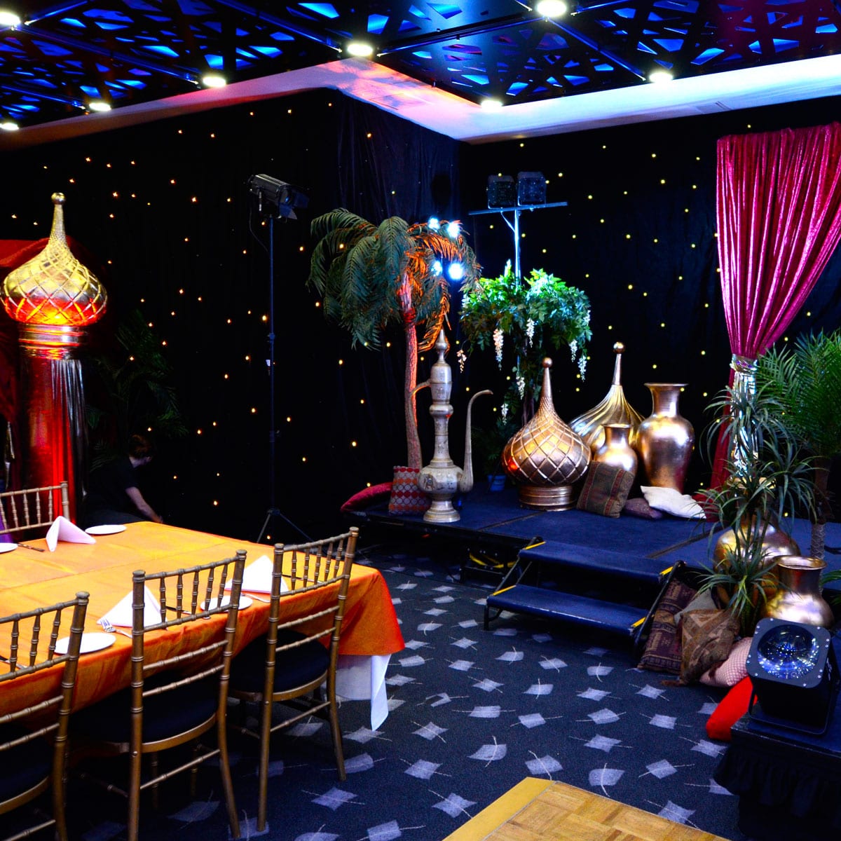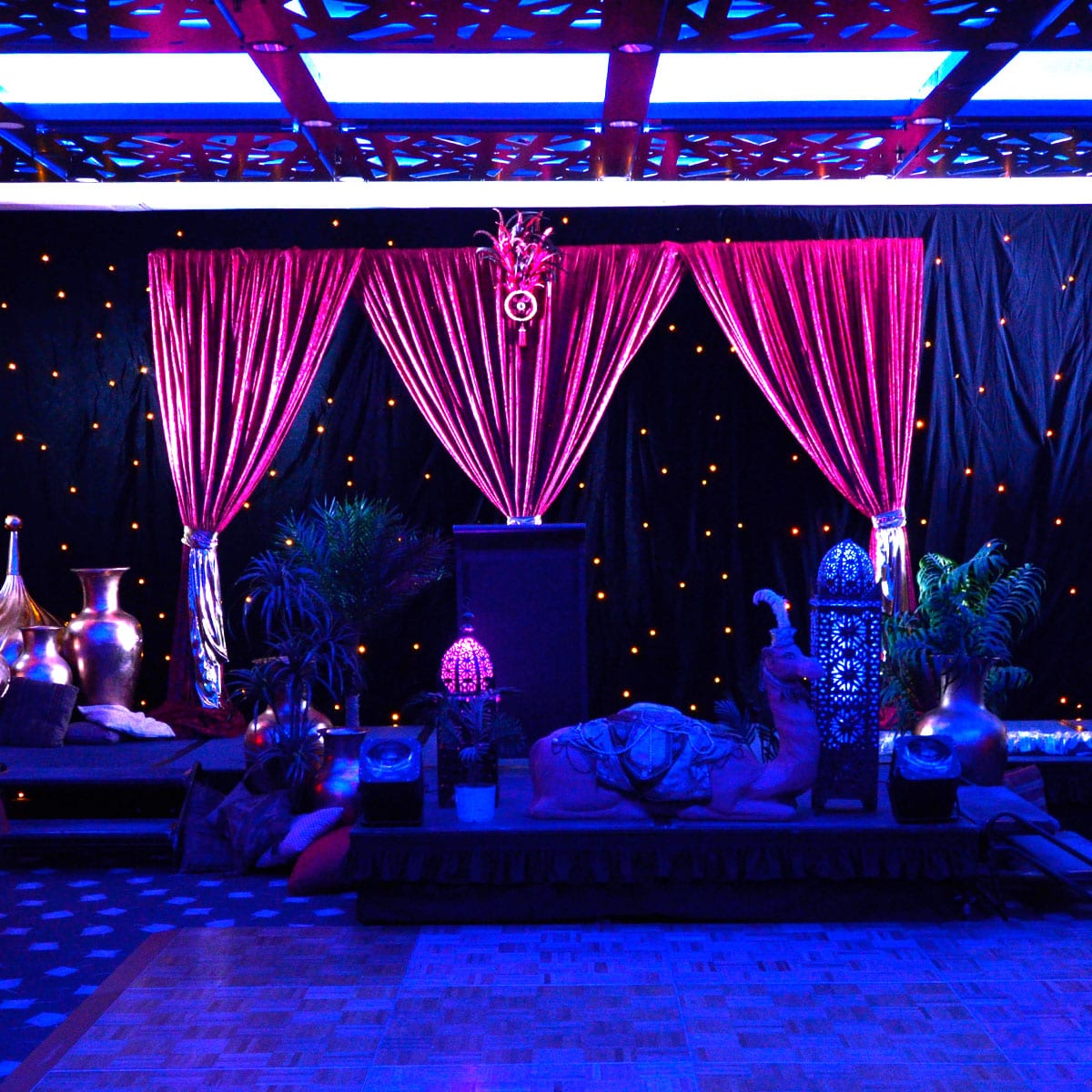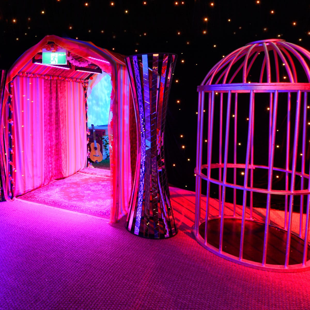 Star Cloth (3x6m runs) with LED lights to create "star" effect.