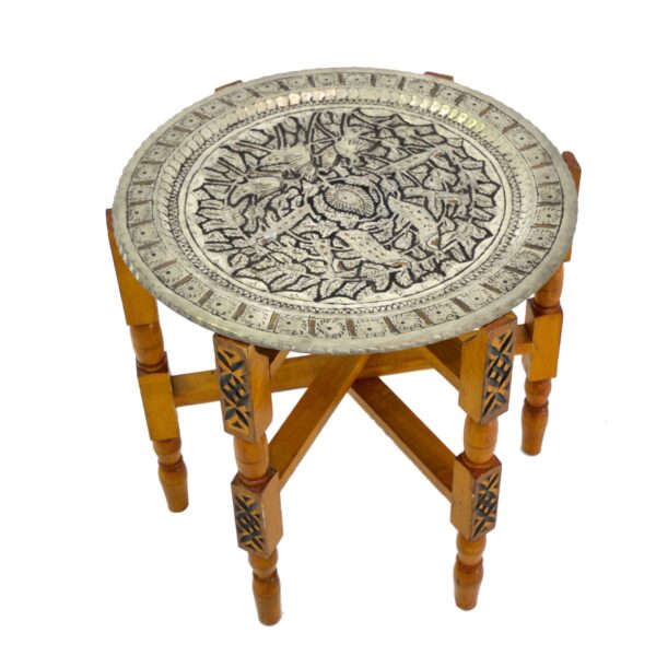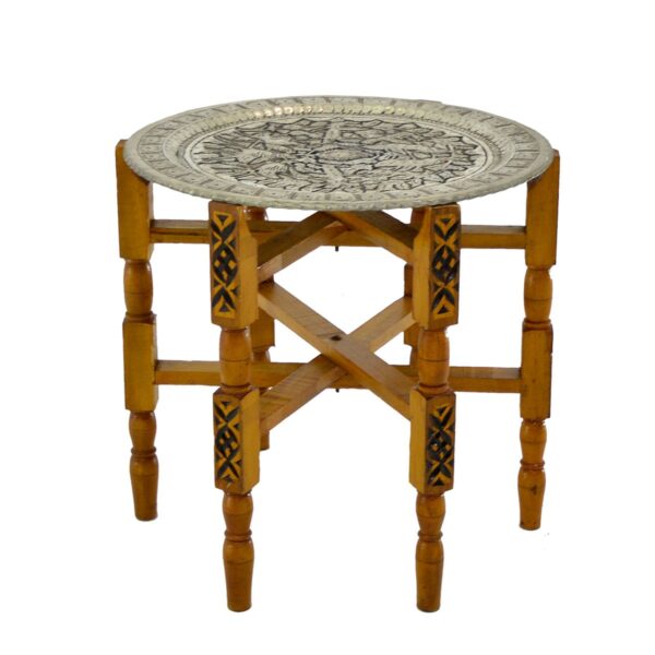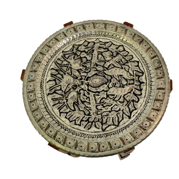 Consists of a large plate sitting on top of an ornate wooden stand.