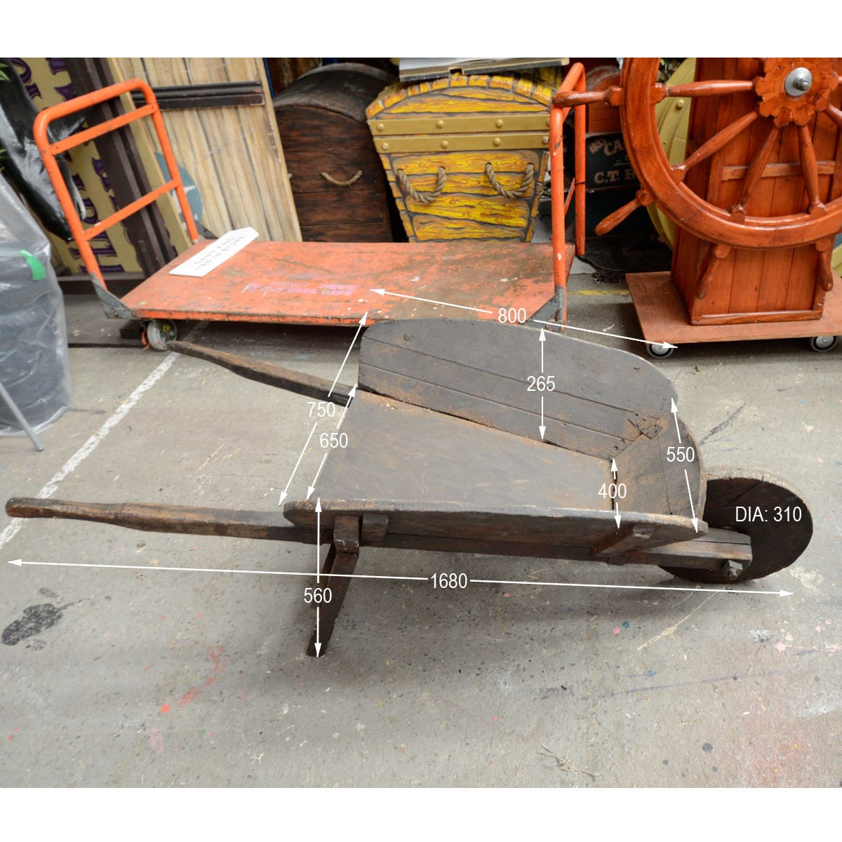 Rustic wooden wheelbarrow with metal wheel, sturdy timber legs.