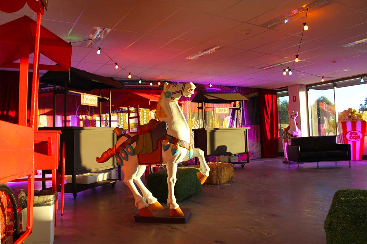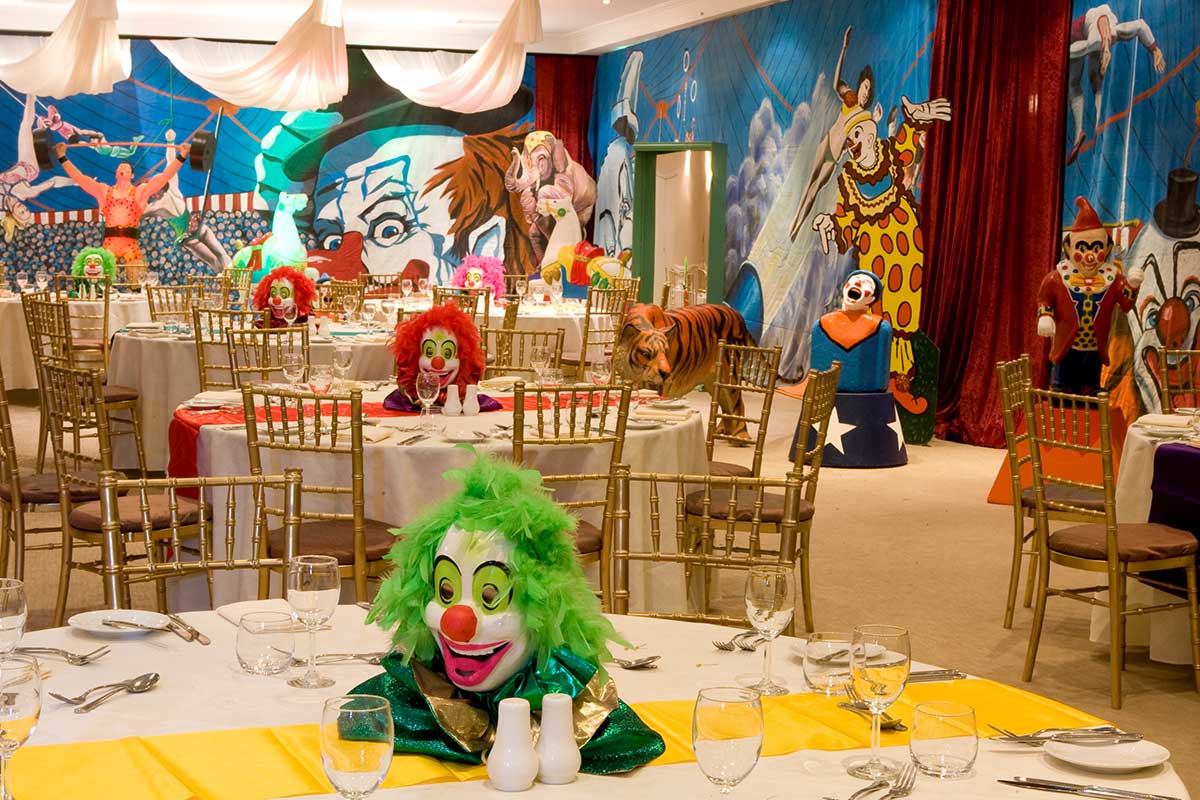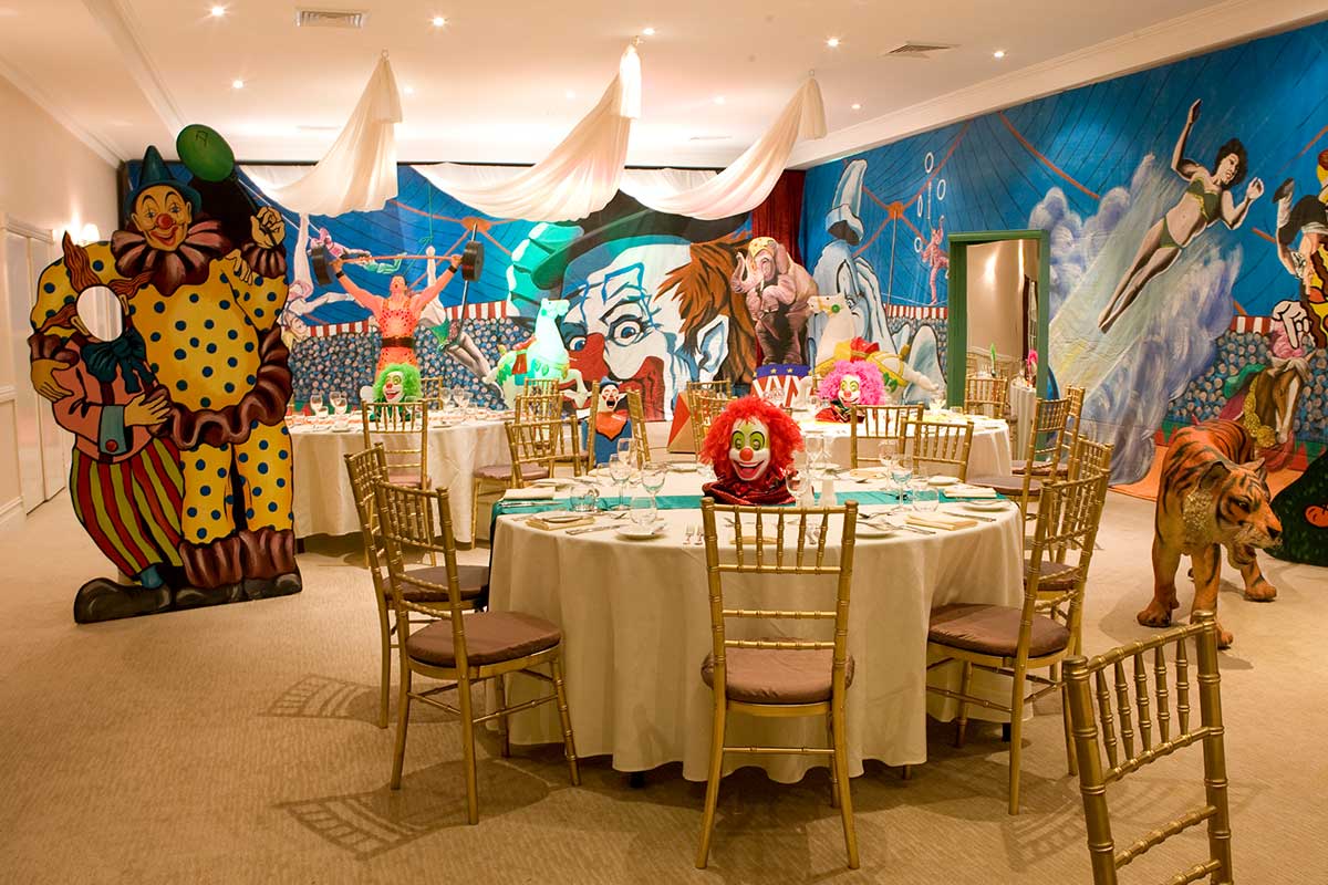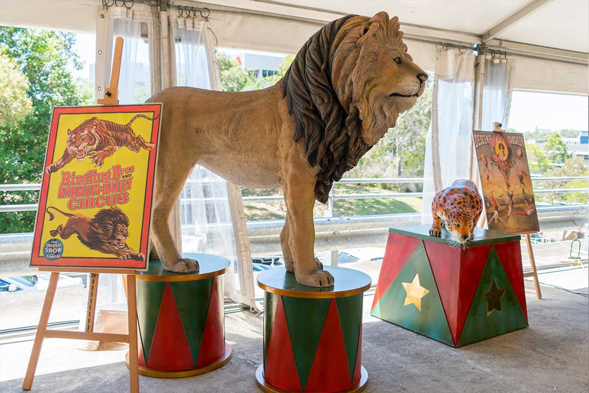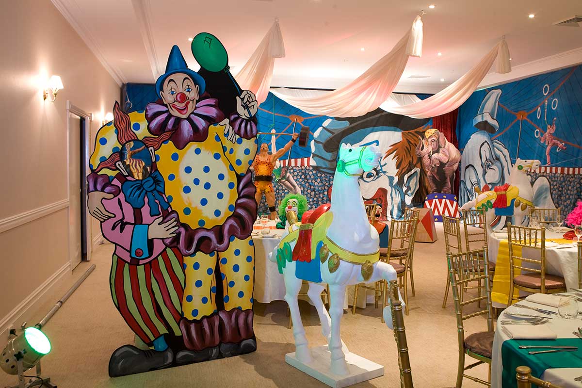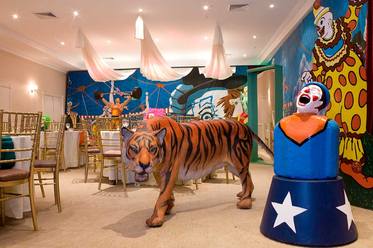 Brightly painted circus podiums, plinths, funny mirrors, animal cages, hay bales, barrels and sideshow alley features are used to style the space. Add a Box Office, pretzel stand and kissing booth along with a chocolate wheel and raffle barrel to engage and surprise your guests. Complete the theme with exotic animals such as zebras, elephants, giraffes, rhinoceros, lions, tigers; colourful carousel horses, a strong man and a variety of clowns and acrobats. Food service carts and sellers trays can be supplied as well as tables and seating, table decor, lighting, star cloths, velvet drapes and red carpet.