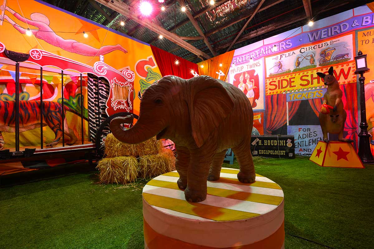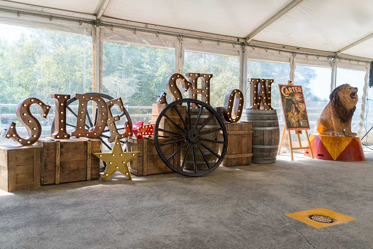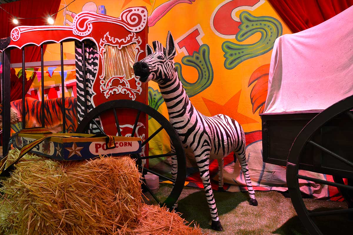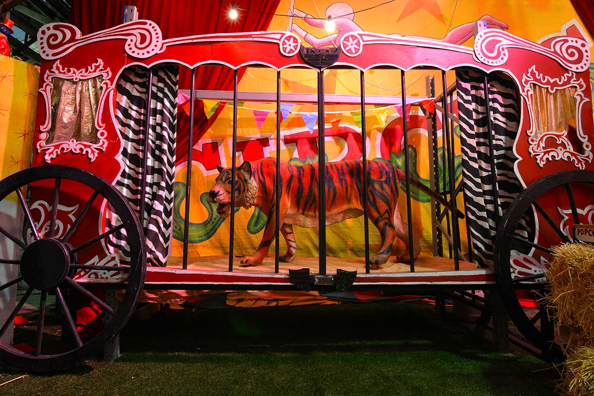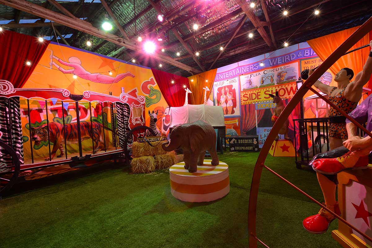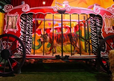 Brightly painted circus podiums, plinths, funny mirrors, animal cages, hay bales, barrels and sideshow alley features are used to style the space. Add a Box Office, pretzel stand and kissing booth along with a chocolate wheel and raffle barrel to engage and surprise your guests. Complete the theme with exotic animals such as zebras, elephants, giraffes, rhinoceros, lions, tigers; colourful carousel horses, a strong man and a variety of clowns and acrobats. Food service carts and sellers trays can be supplied as well as tables and seating, table decor, lighting, star cloths, velvet drapes and red carpet.