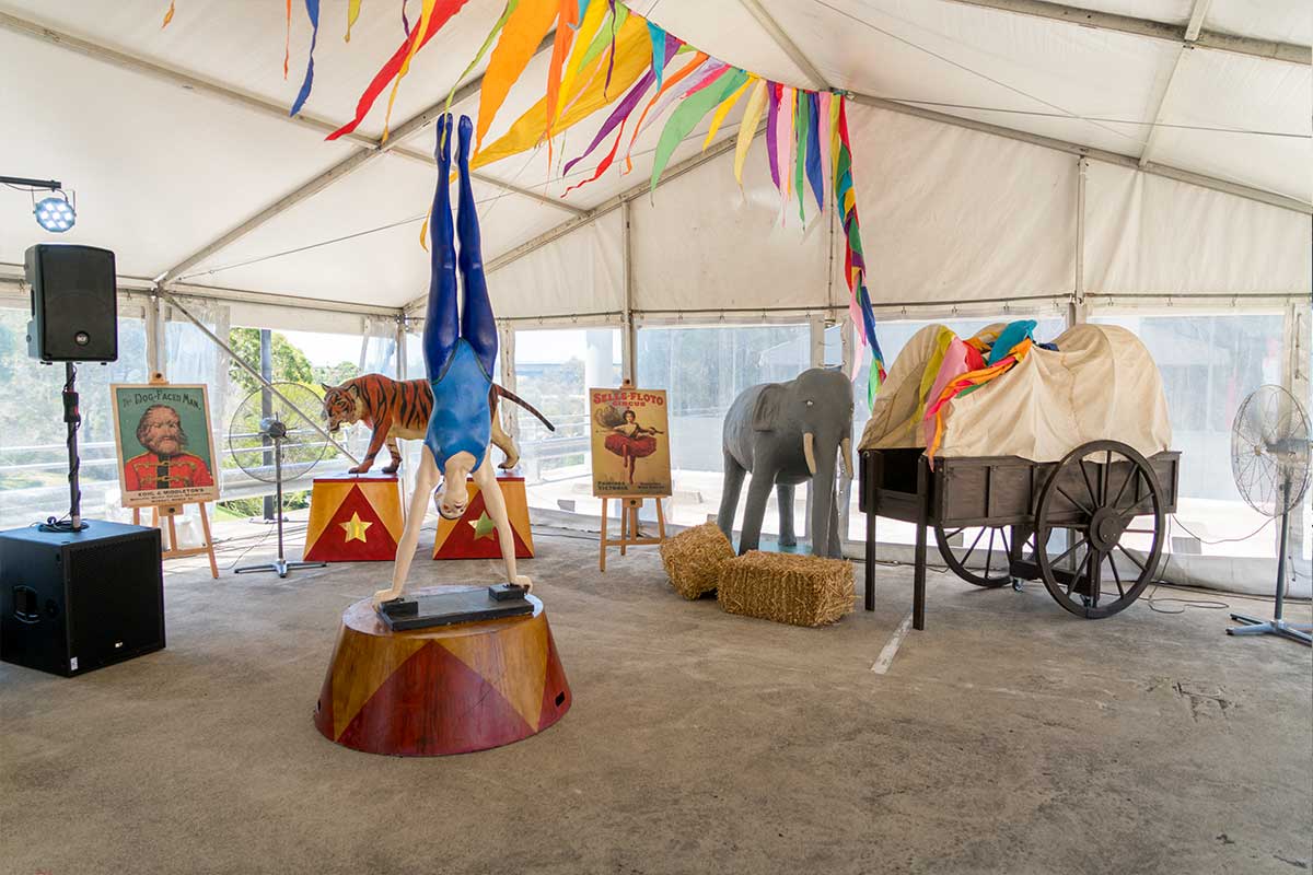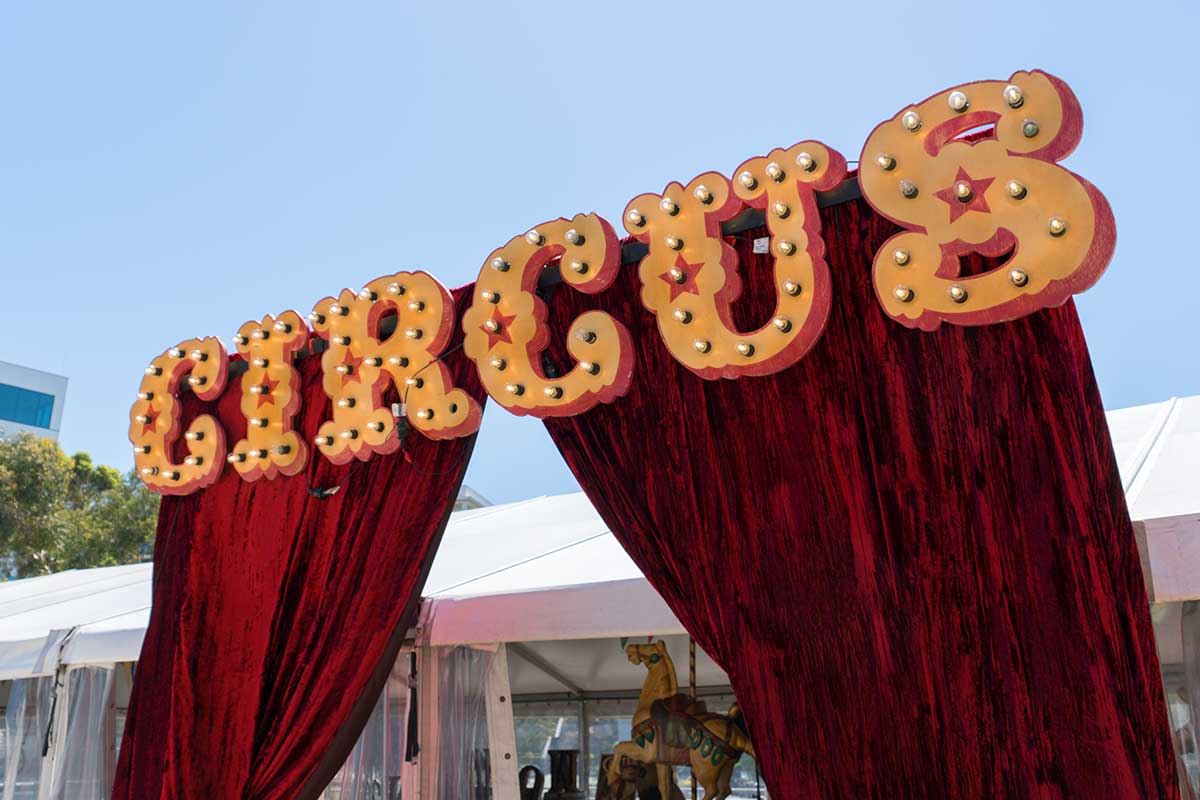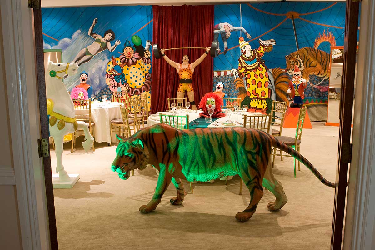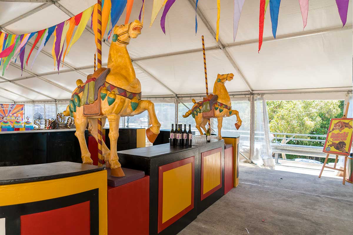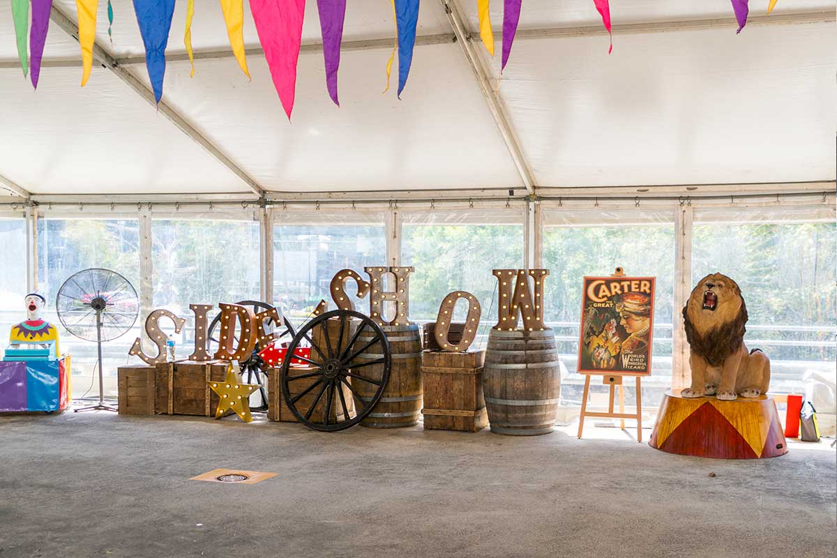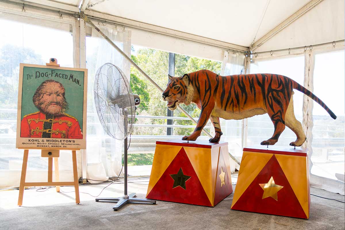 Brightly painted circus podiums, plinths, funny mirrors, animal cages, hay bales, barrels and sideshow alley features are used to style the space. Add a Box Office, pretzel stand and kissing booth along with a chocolate wheel and raffle barrel to engage and surprise your guests. Complete the theme with exotic animals such as zebras, elephants, giraffes, rhinoceros, lions, tigers; colourful carousel horses, a strong man and a variety of clowns and acrobats. Food service carts and sellers trays can be supplied as well as tables and seating, table decor, lighting, star cloths, velvet drapes and red carpet.