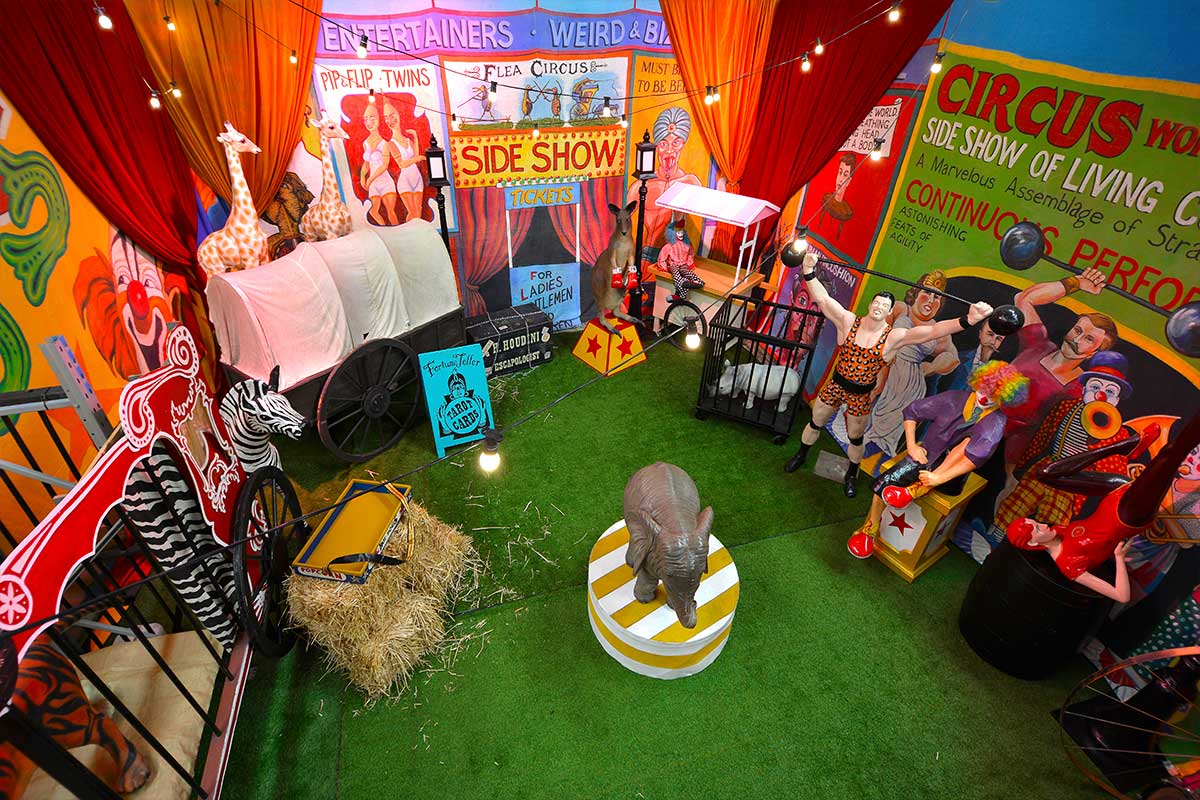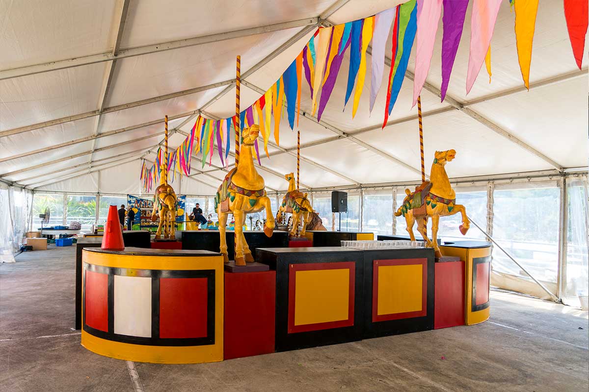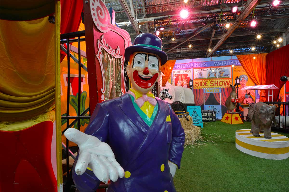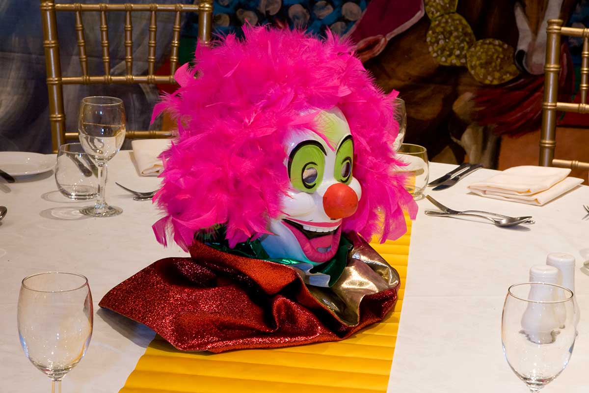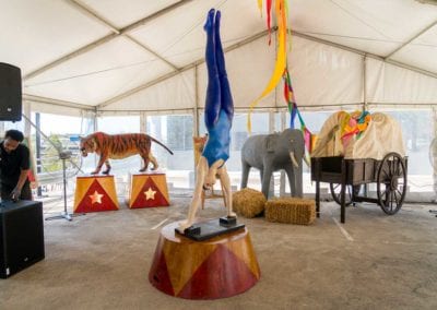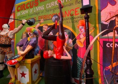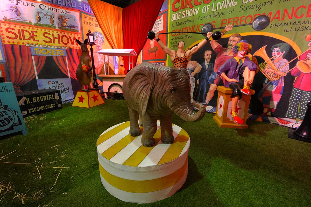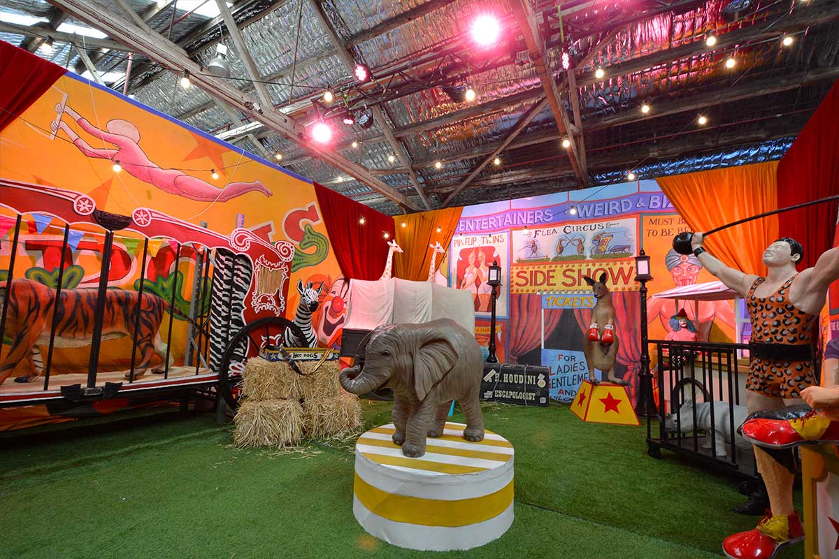 Brightly painted circus podiums, plinths, funny mirrors, animal cages, hay bales, barrels and sideshow alley features are used to style the space. Add a Box Office, pretzel stand and kissing booth along with a chocolate wheel and raffle barrel to engage and surprise your guests. Complete the theme with exotic animals such as zebras, elephants, giraffes, rhinoceros, lions, tigers; colourful carousel horses, a strong man and a variety of clowns and acrobats. Food service carts and sellers trays can be supplied as well as tables and seating, table decor, lighting, star cloths, velvet drapes and red carpet.