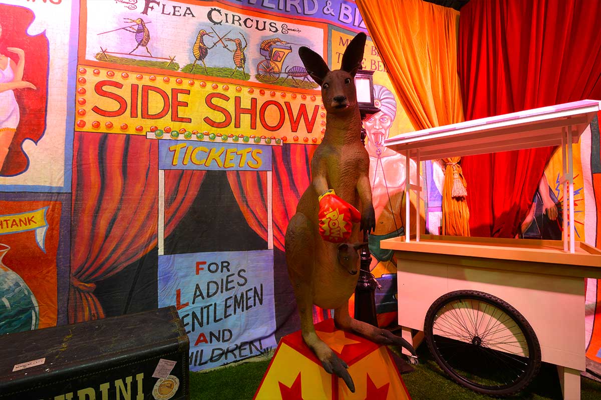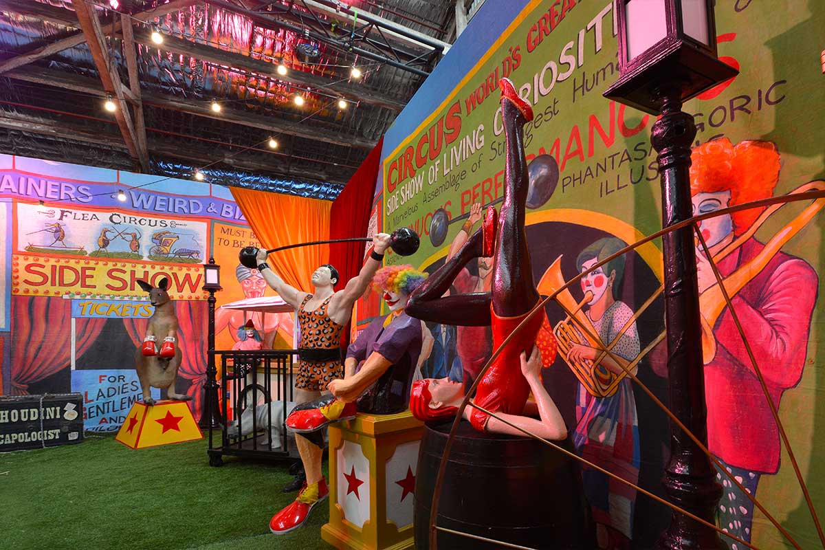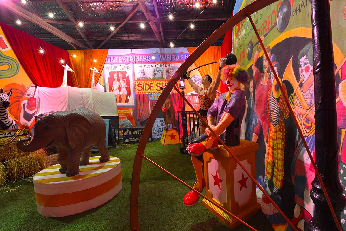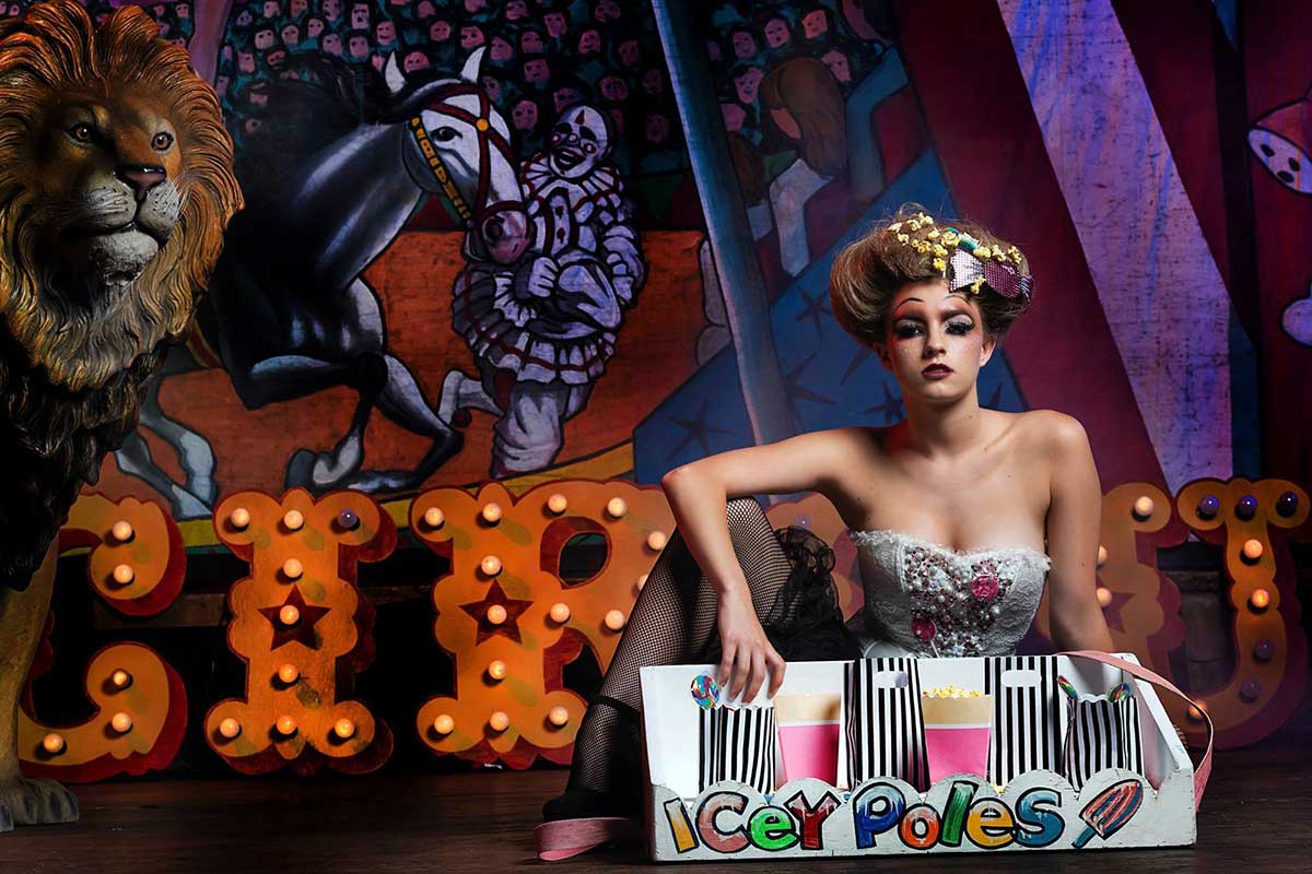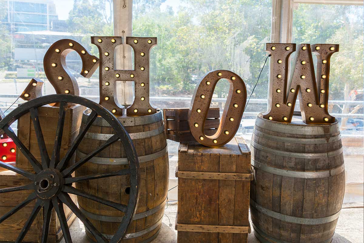 Brightly painted circus podiums, plinths, funny mirrors, animal cages, hay bales, barrels and sideshow alley features are used to style the space. Add a Box Office, pretzel stand and kissing booth along with a chocolate wheel and raffle barrel to engage and surprise your guests. Complete the theme with exotic animals such as zebras, elephants, giraffes, rhinoceros, lions, tigers; colourful carousel horses, a strong man and a variety of clowns and acrobats. Food service carts and sellers trays can be supplied as well as tables and seating, table decor, lighting, star cloths, velvet drapes and red carpet.