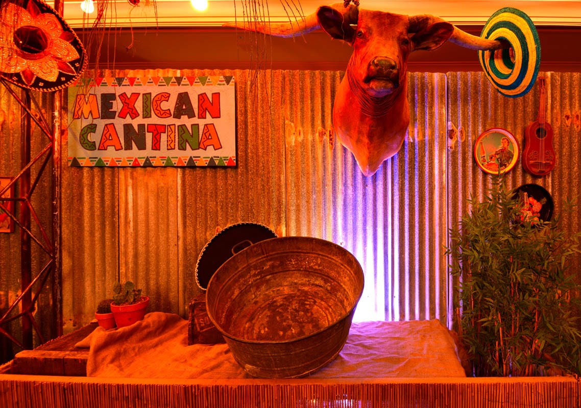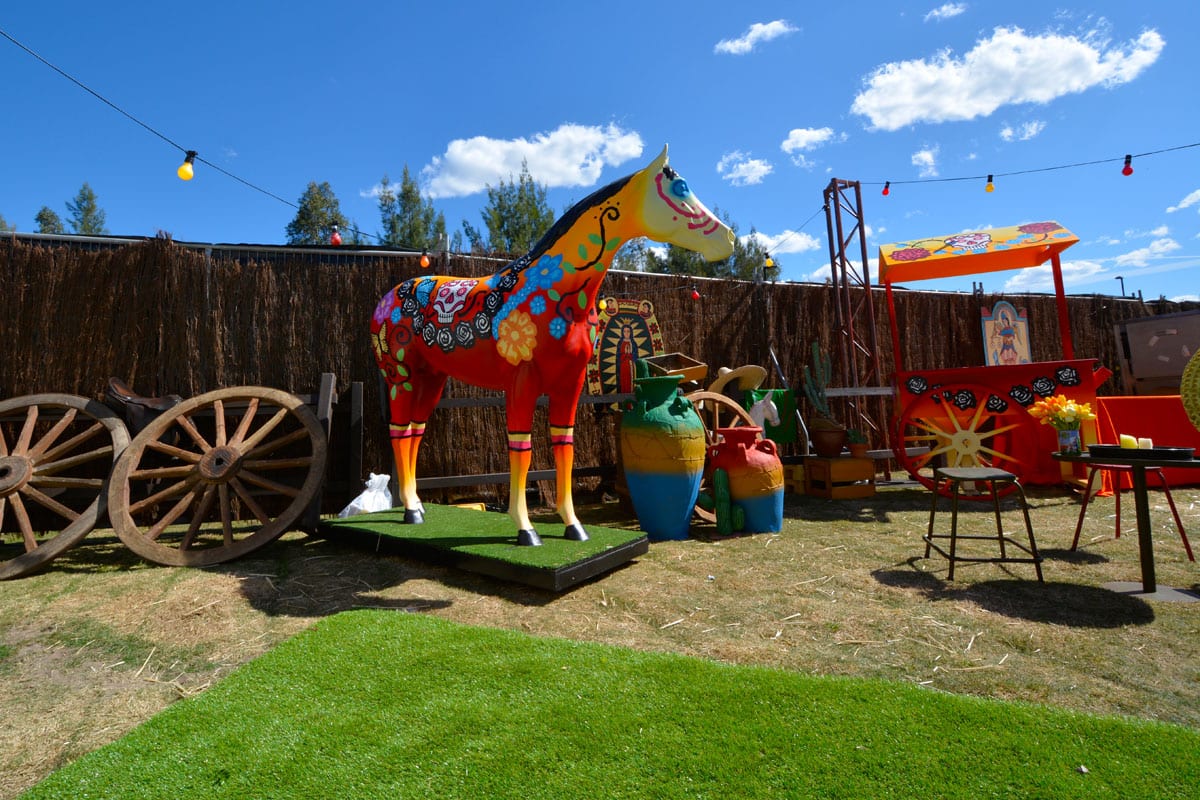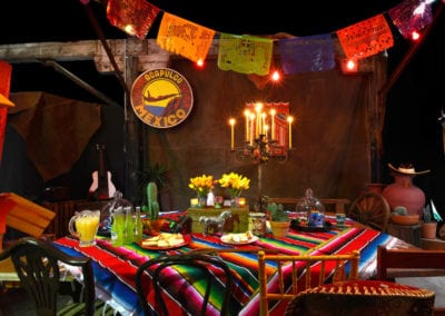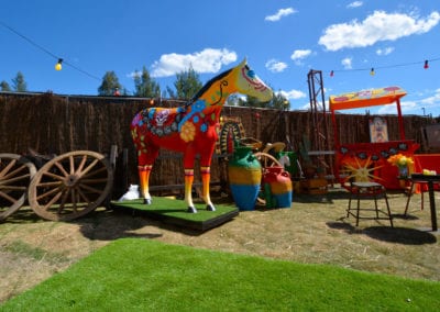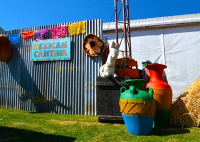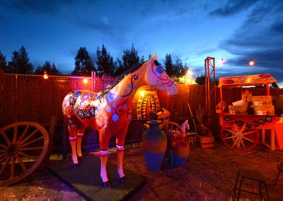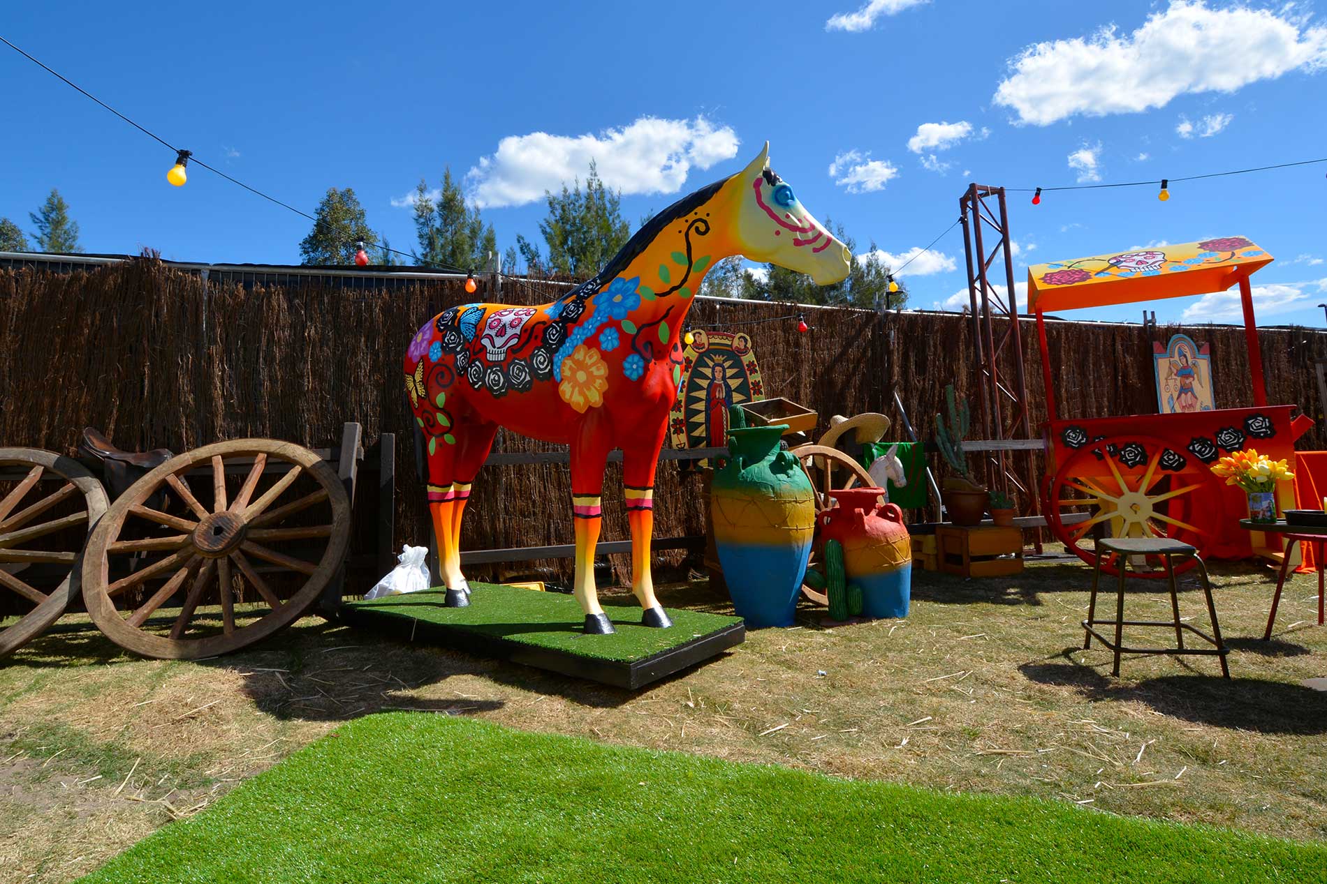 Simply fill your venue space with a selection of Mexican style props and decorative elements such as brightly hand painted vases and urns, metal ware, wall hangings, religious iconography and carved animals, as well as wooden barrels, stacked haybales and strings of festoon lighting. A colourful Mexican style service cart and handpainted full size Mexican horse add to the fun of the theme, whilst simple rustic furniture comfortably accomodates your guests. This theme is always a hit and a popular choice for private events and special occasion. Always colourful during the day and absolutely stunning by night!
