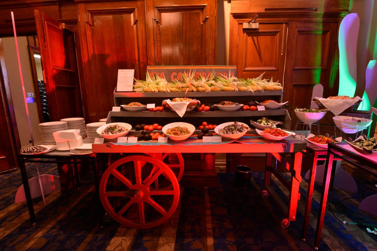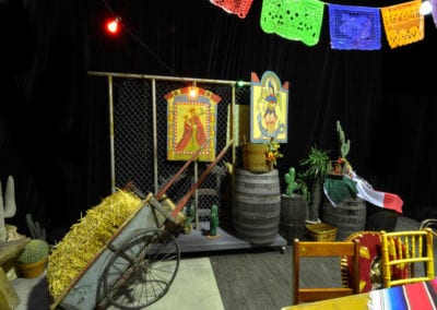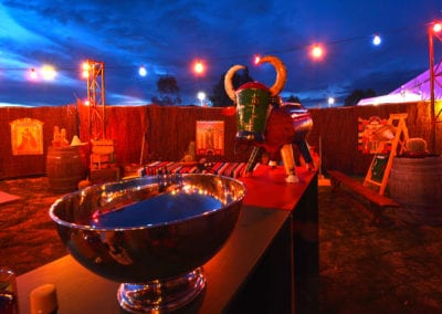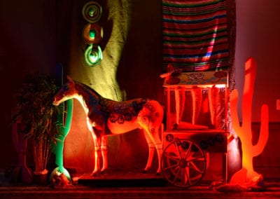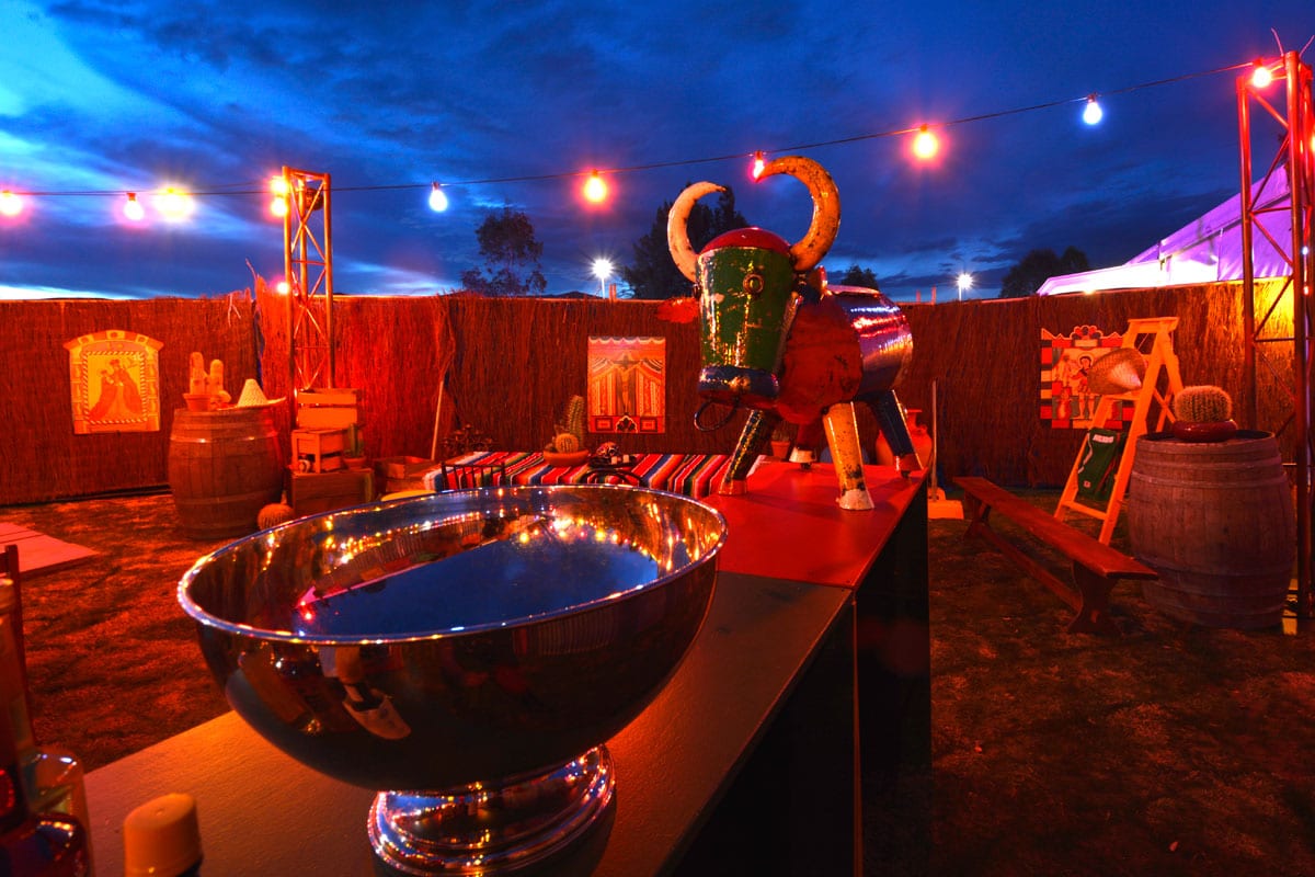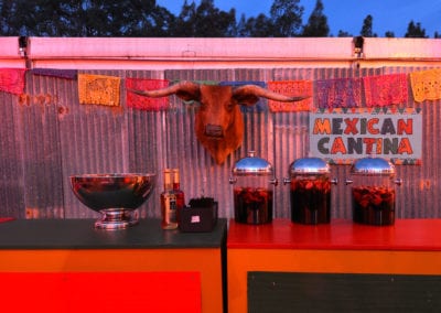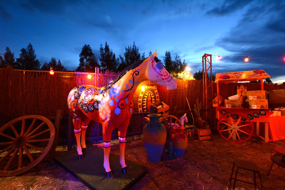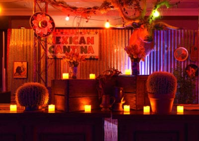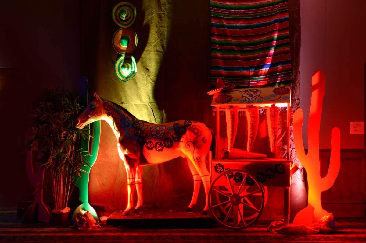 Simply fill your venue space with a selection of Mexican style props and decorative elements such as brightly hand painted vases and urns, metal ware, wall hangings, religious iconography and carved animals, as well as wooden barrels, stacked haybales and strings of festoon lighting. A colourful Mexican style service cart and handpainted full size Mexican horse add to the fun of the theme, whilst simple rustic furniture comfortably accomodates your guests. This theme is always a hit and a popular choice for private events and special occasion. Always colourful during the day and absolutely stunning by night!