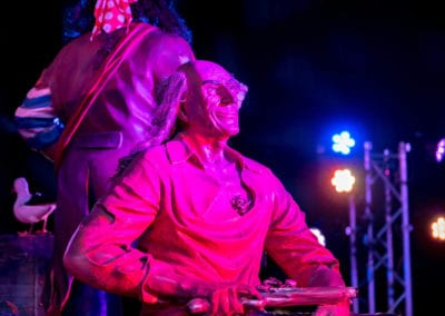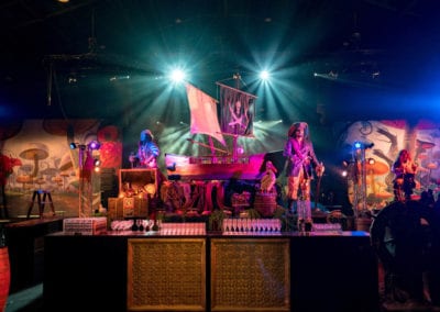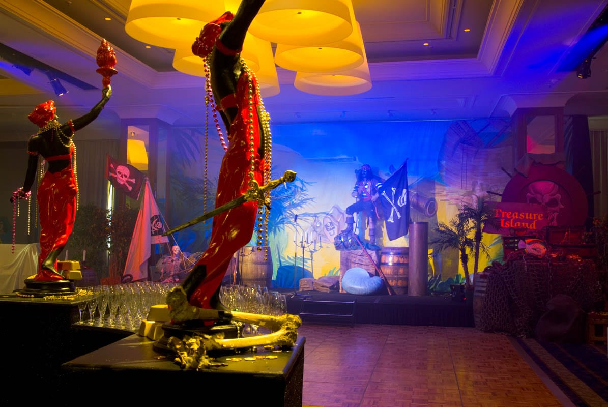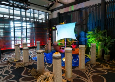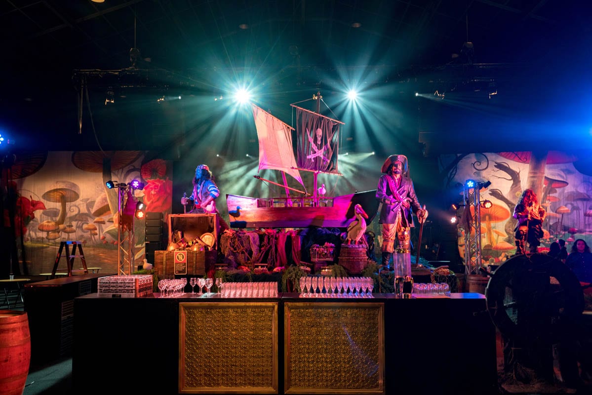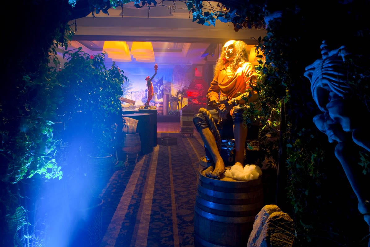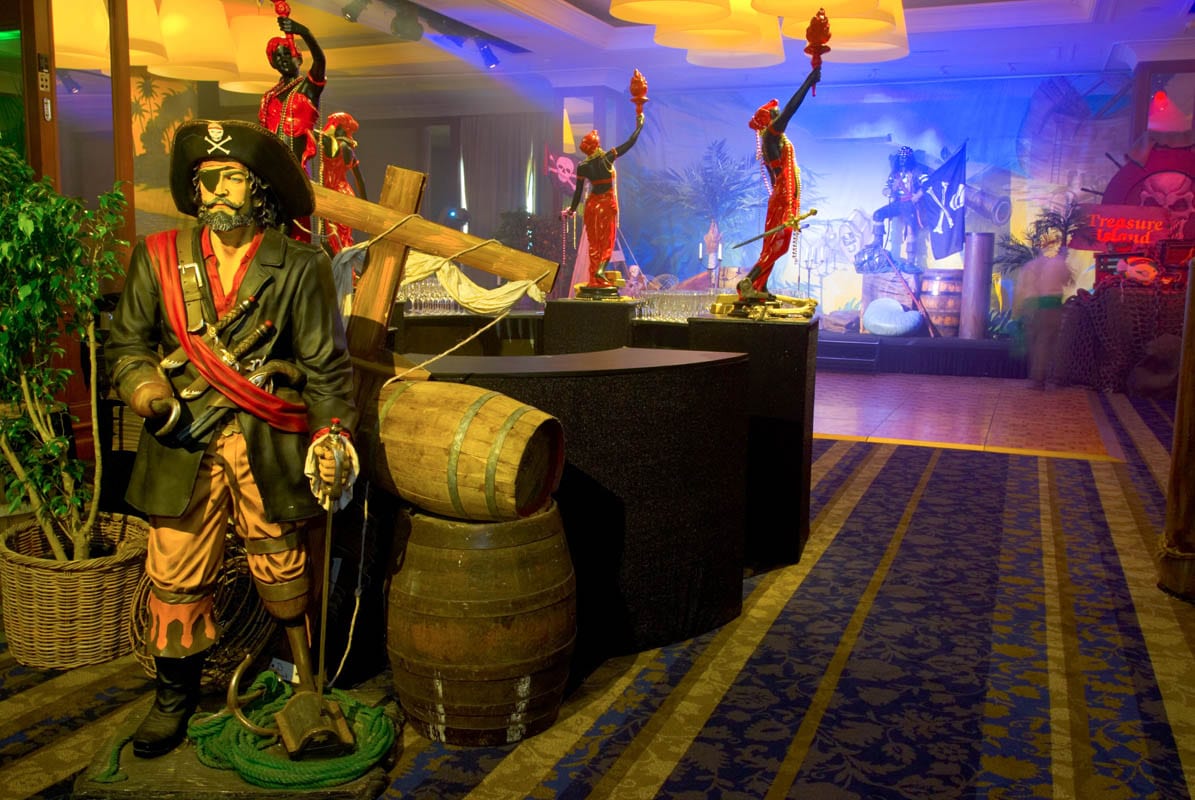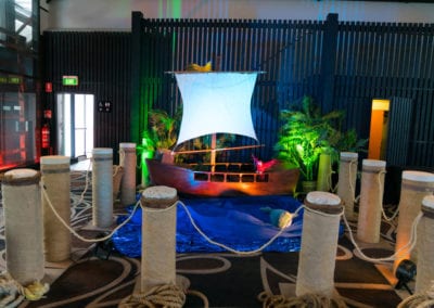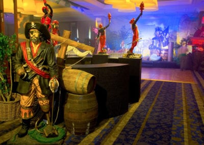 Shiver me timbers me hearties! This is one of our most popular event themes where we can create a tropical cove; with a beach that transitions to a jungle setting where banquet tables await your guests. Sea faring buccaneers cordially escort your guests through a tunnel entrance that leads to a hidden pirate cove, revealing a cocktail bar adorned with stolen treasure, sumptuous delights and exotic fruits. Guests and party goers can find their sea legs and dance a jig on the dance floor decked with cannons, wooden wine barrels, whilst a life size pirate captain statue keeps a lookout from the helm. Other Pirate and Nautical Themed props including ropes, chains, bollards, ships wheel, anchors, assorted treasures chest and of course a skull and crossbones pirate flag add to the decor of the setting.